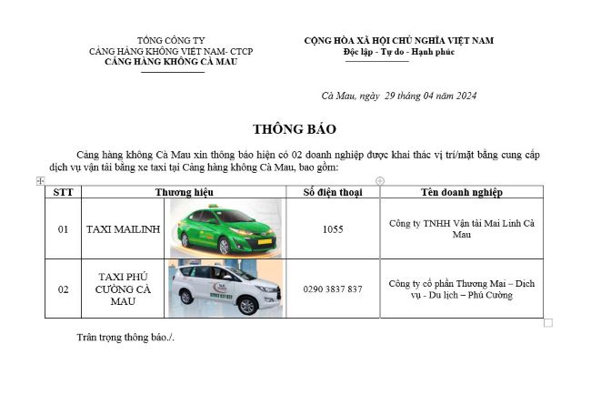 Thông báo các hãng TAXI được khai thác cung cấp dịch vụ vận tải tại Cảng hàng không Cà Mau