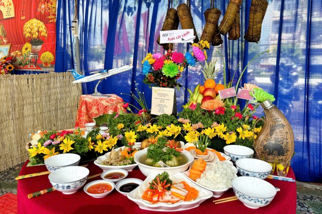 Đồng hành cùng Khóm 16, Cảng Hàng không Cà Mau đã tham gia hội thi với gian hàng chủ đề “Sắc Xuân” – tái hiện không gian Tết truyền thống đậm bản sắc Nam Bộ. Gian hàng được trang trí trang trọng với không gian thờ thờ Bác Hồ, thể hiện lòng biết ơn và sự thành kính; cùng những đòn bánh tét mộc mạc, và mâm cơm chuẩn vị miền Nam hào sảng.