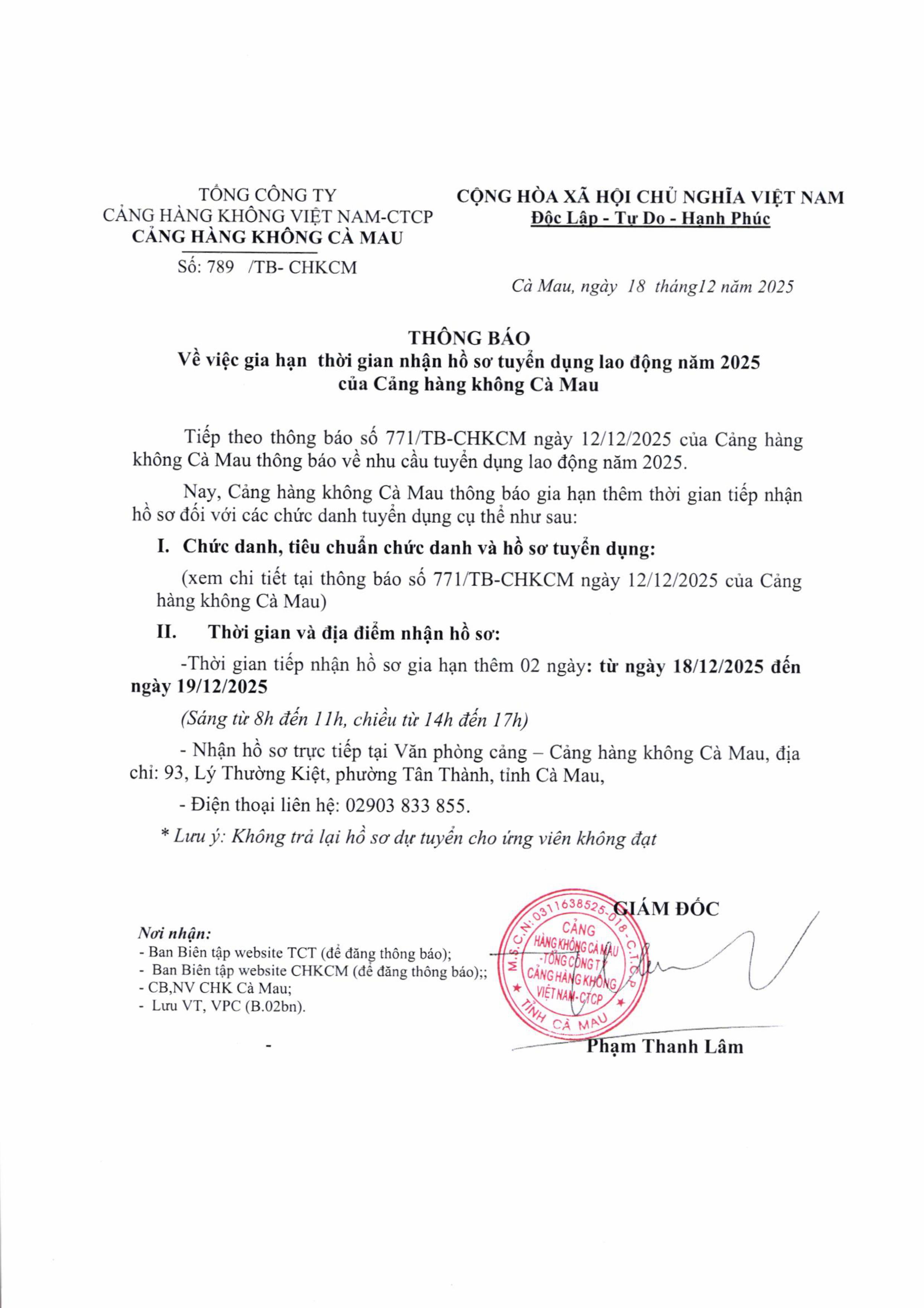 Thông báo về việc gia hạn thời gian nhận hồ sơ tuyển dụng lao động năm 2025