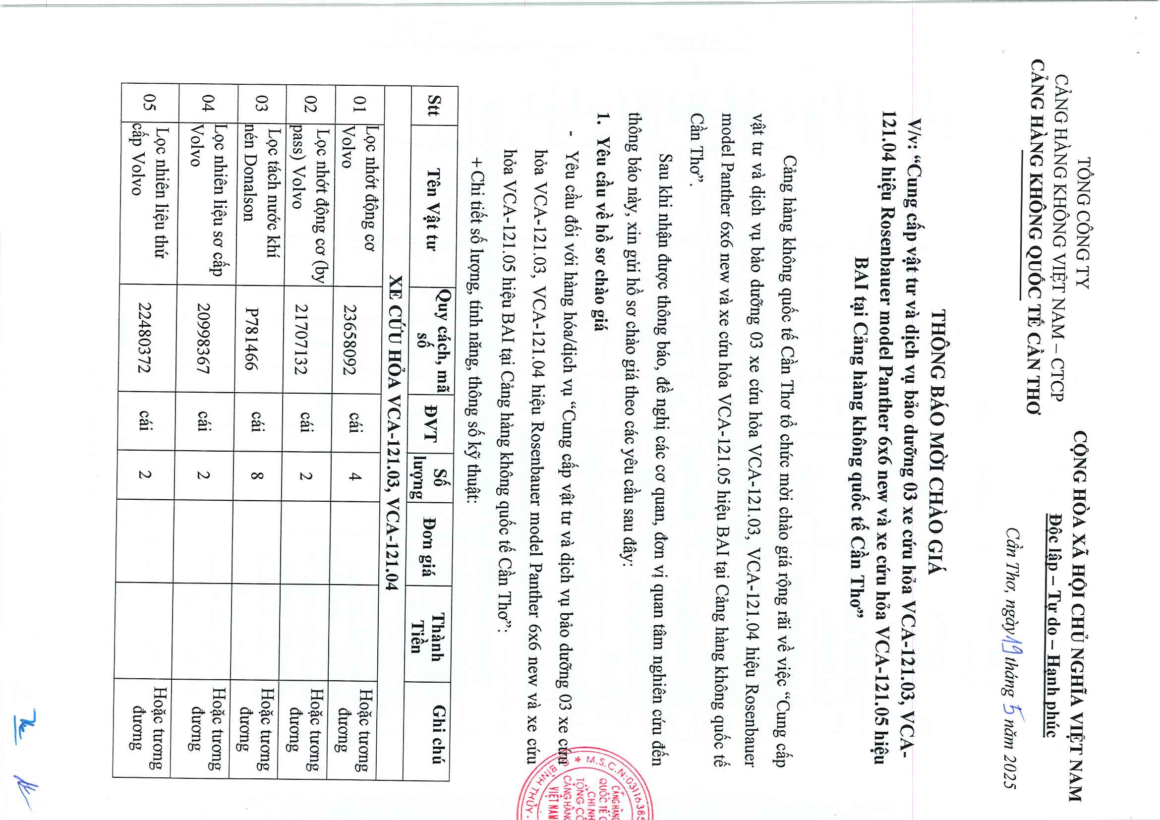 THÔNG BÁO MỜI CHÀO GIÁ Vv "Cung cấp vật tư và dịch vụ bảo dưỡng 03 xe cứu hỏa VCA-121.03, VCA-121.04 hiệu Rosenbauer model Panther 6x6 new và xe cứu hỏa VCA-121.05 hiệu BAI tại Cảng hàng không quốc tế Cần Thơ"