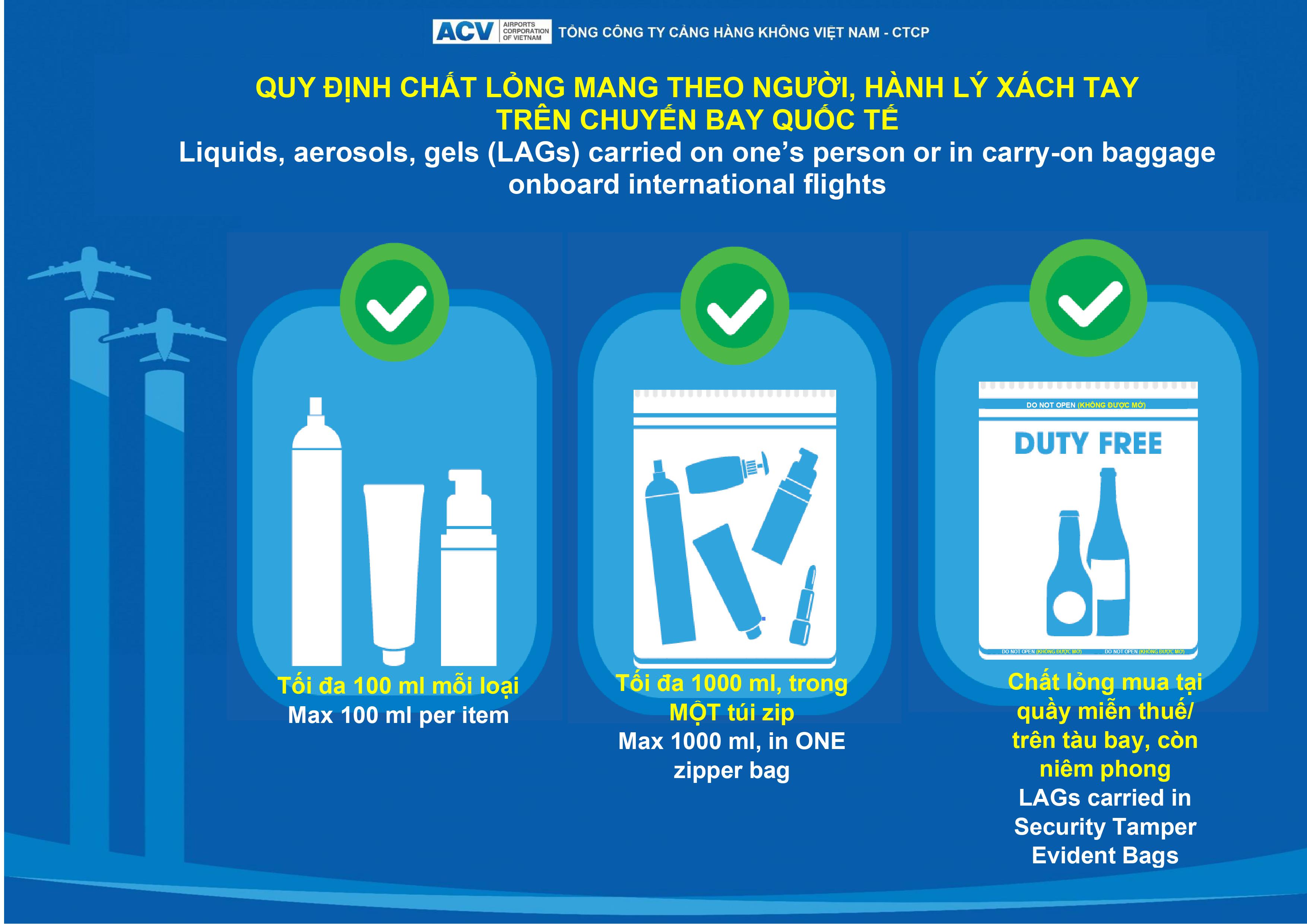 - Quy định chất lỏng mang theo người, hành lý xách tay trên chuyến bay quốc tế (Liquids, aerosols, gels (LAGs) carried on one's person or in carry-on baggage onboard international flights):