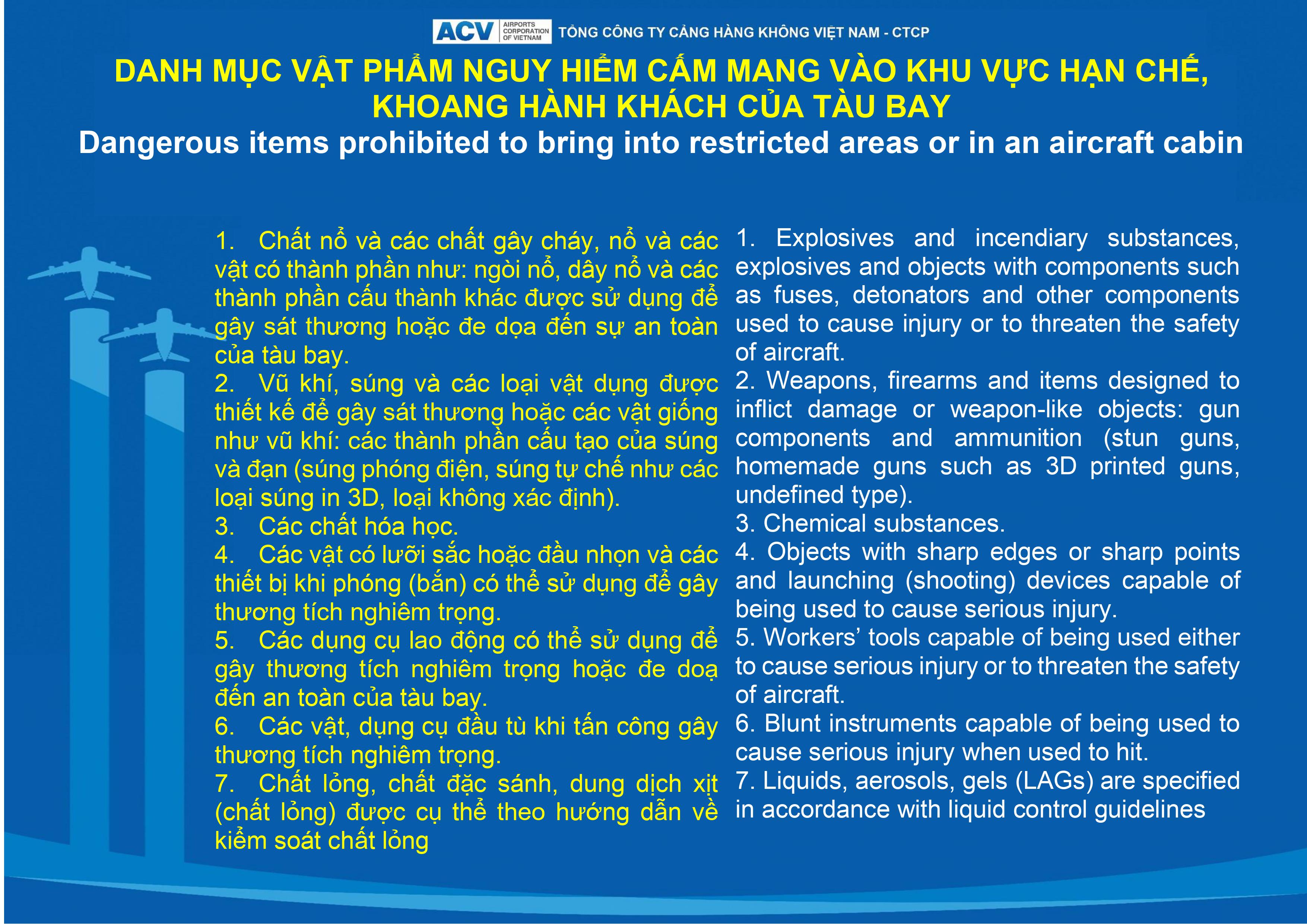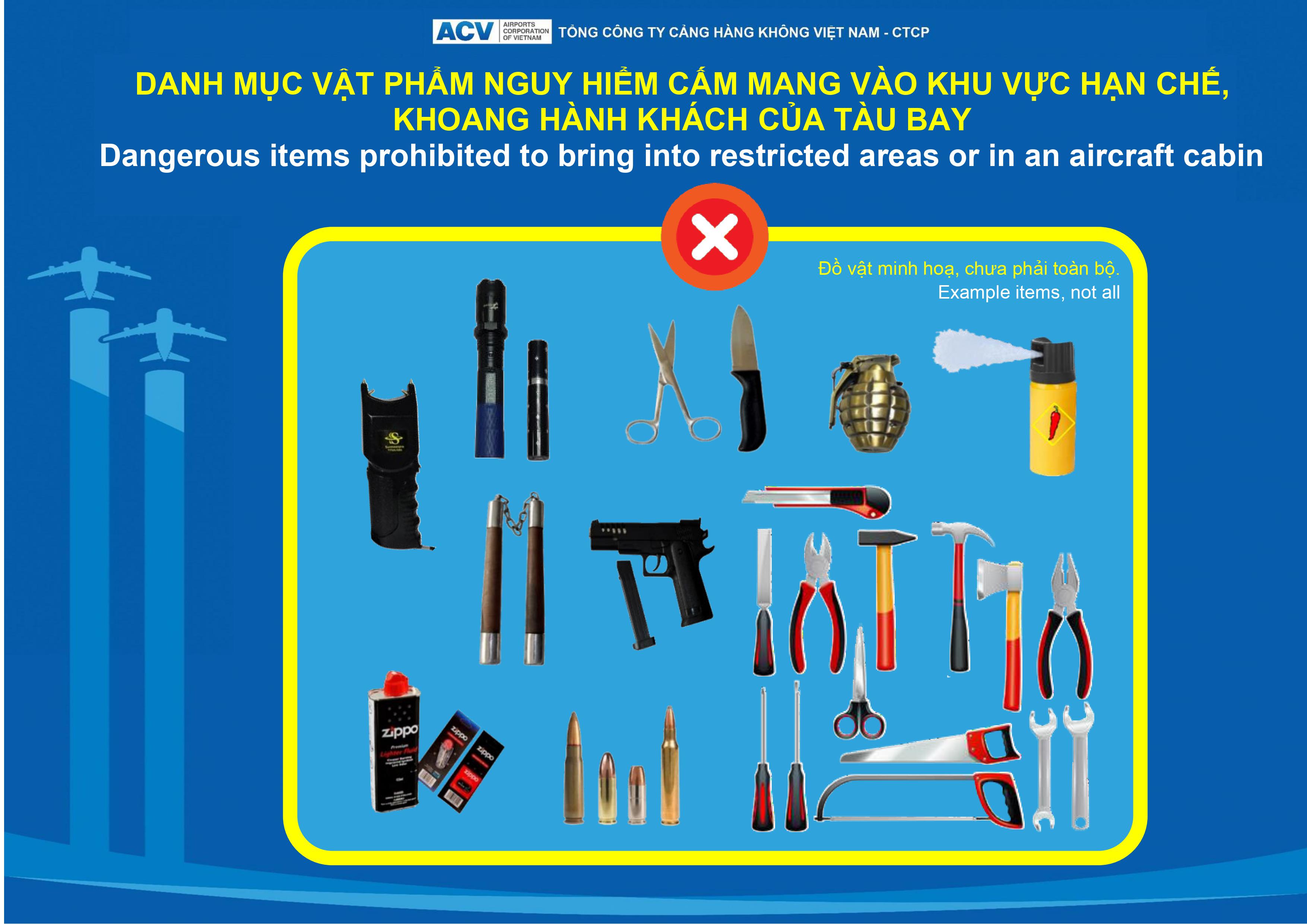 - Danh mục vật phẩm nguy hiểm cấm mang vào khu vực hạn chế, khoang hành khách của tàu bay (Dangerous items prohibited to bring into restricted areas or in an aircraft cabin):
