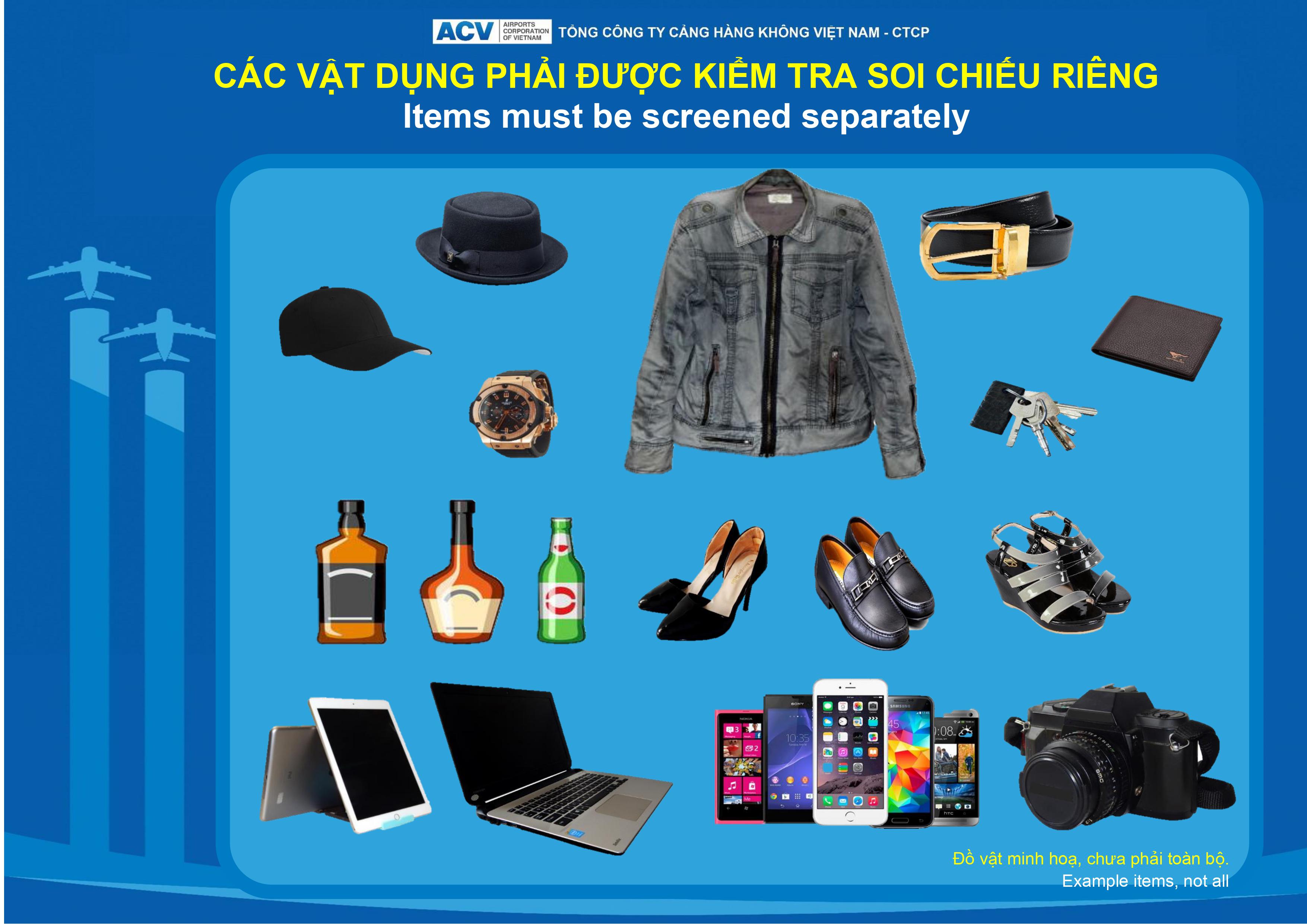 - Các vật dụng phải được kiểm tra soi chiếu riêng (Items must be screened separately):