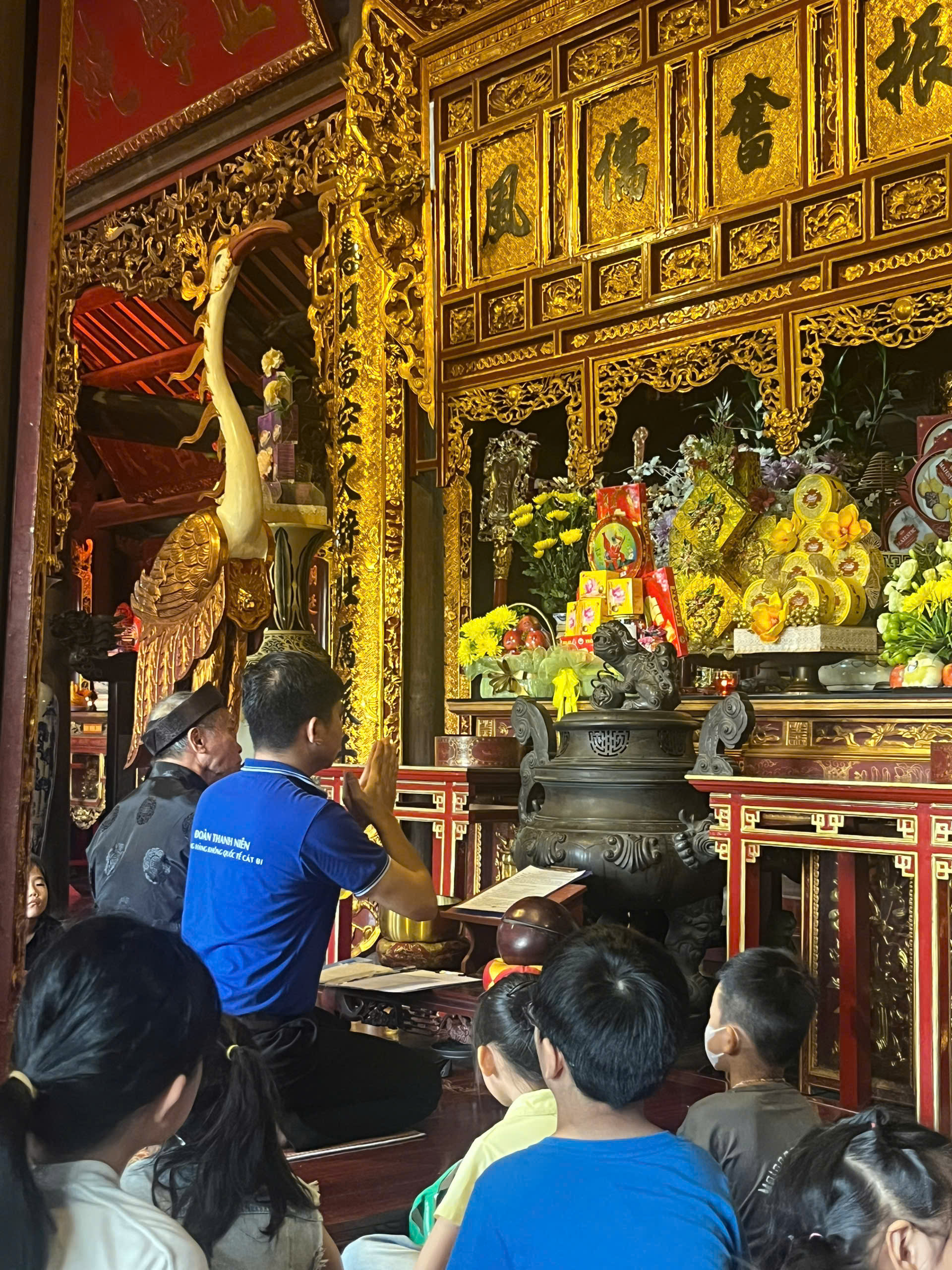 Điểm dừng chân đầu tiên trong chuyến hành trình ngày hôm nay là đền thờ "Vạn thế sư biểu" Chu Văn An. Đền thờ thầy là nơi linh thiêng giữa khung cảnh núi rừng chập chùng và được bao bọc bởi dãy núi Phượng Hoàng. Tại đây, đồng chí Đào Đăng Đàn - Bí thư Đoàn thanh niên Cảng HKQT Cát Bi đã đại diện thắp một nén hương tỏ lòng thành kính đối với thầy giáo Chu Văn An.