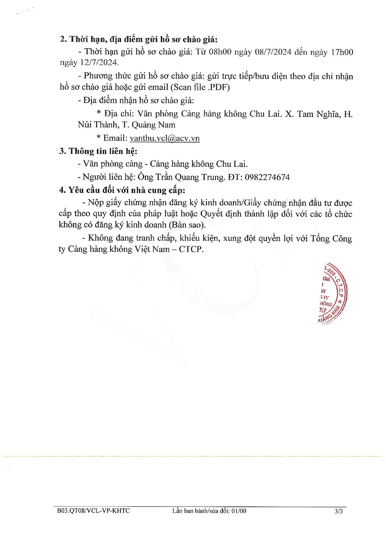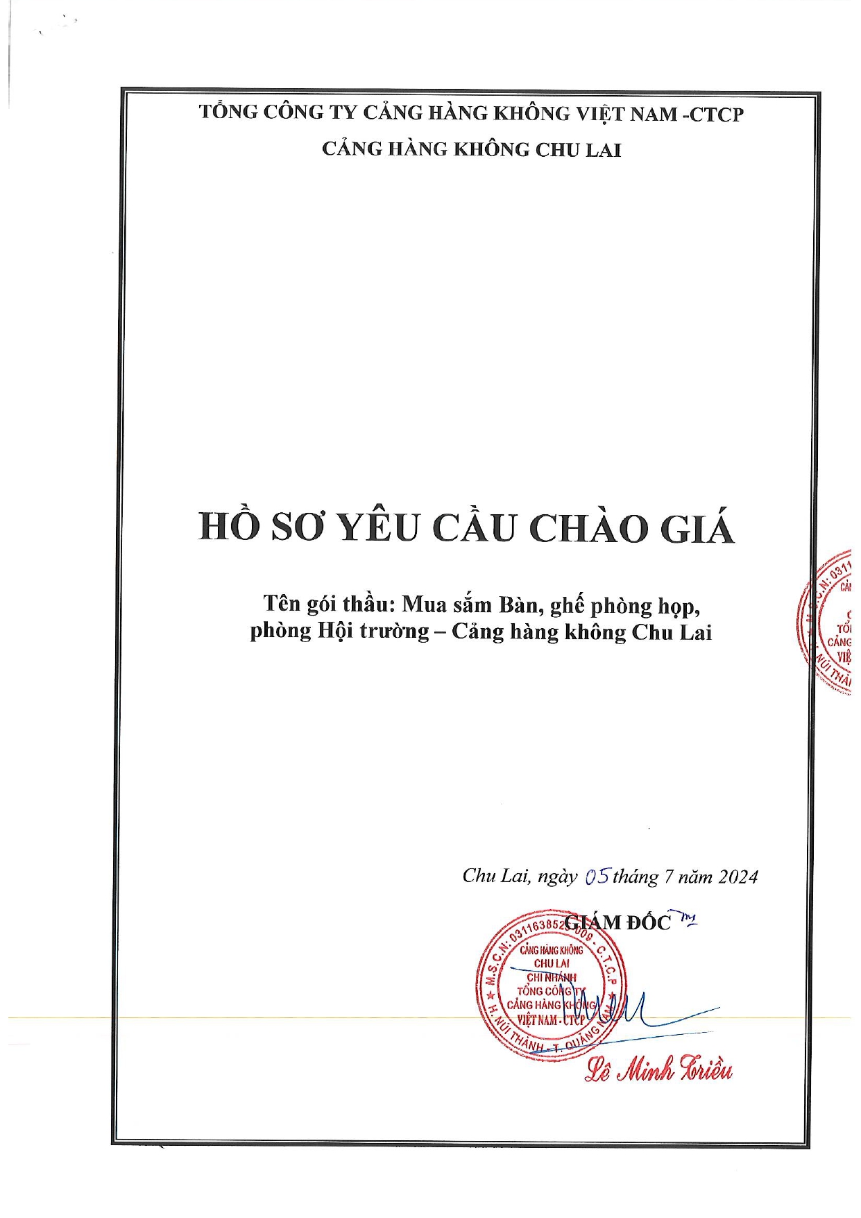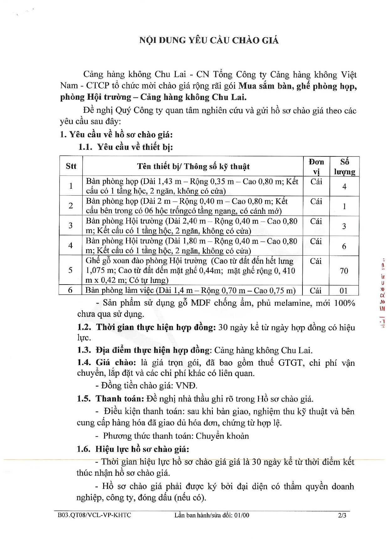 THÔNG BÁO MỜI CHÀO GIÁ V/v Mua sắm Bàn, ghế phòng họp, phòng Hội trường - Cảng hàng không Chu Lai