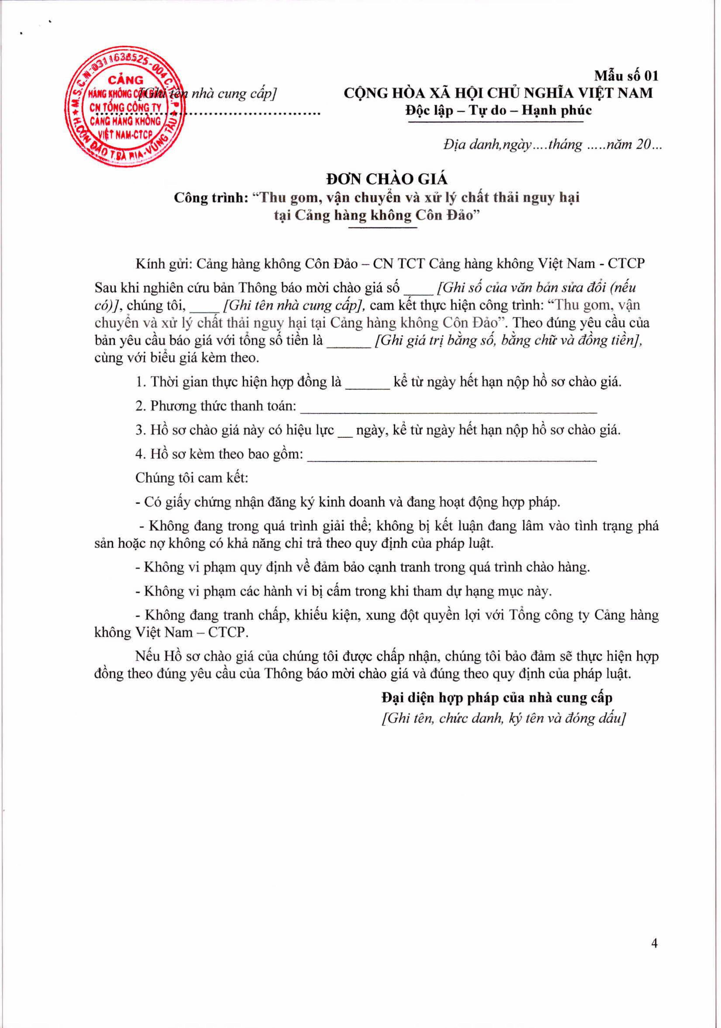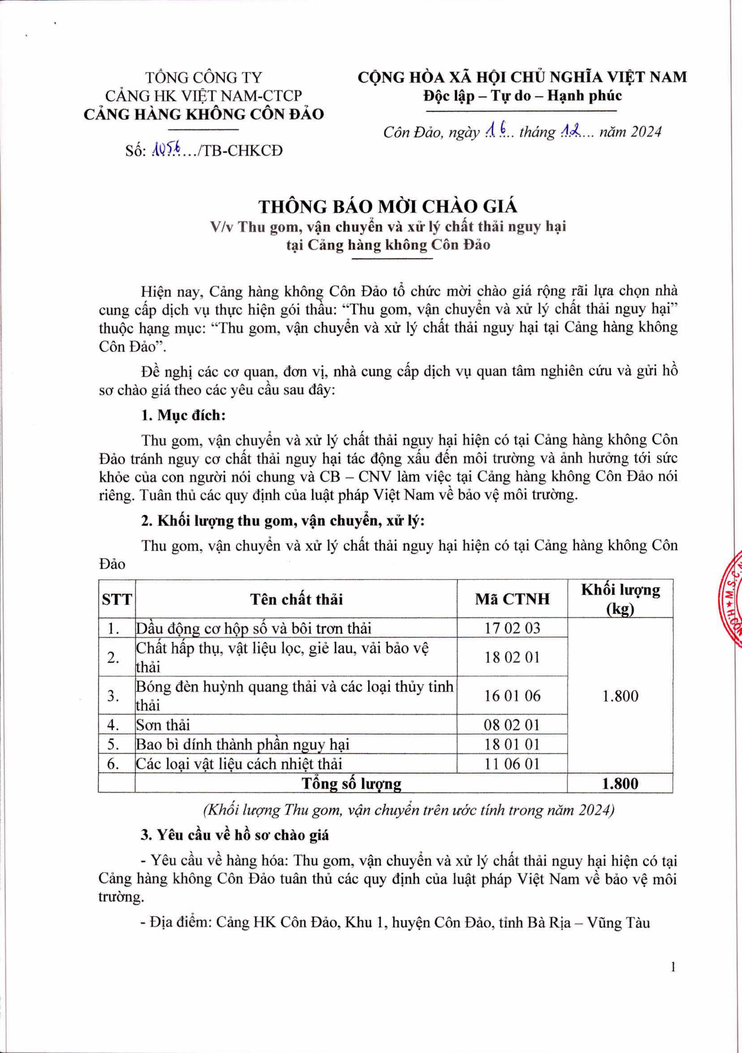 THÔNG BÁO MỜI CHÀO GIÁ V/v Thu gom, vận chuyển và xử lý chất thải nguy hại tại Cảng hàng không Côn Đảo