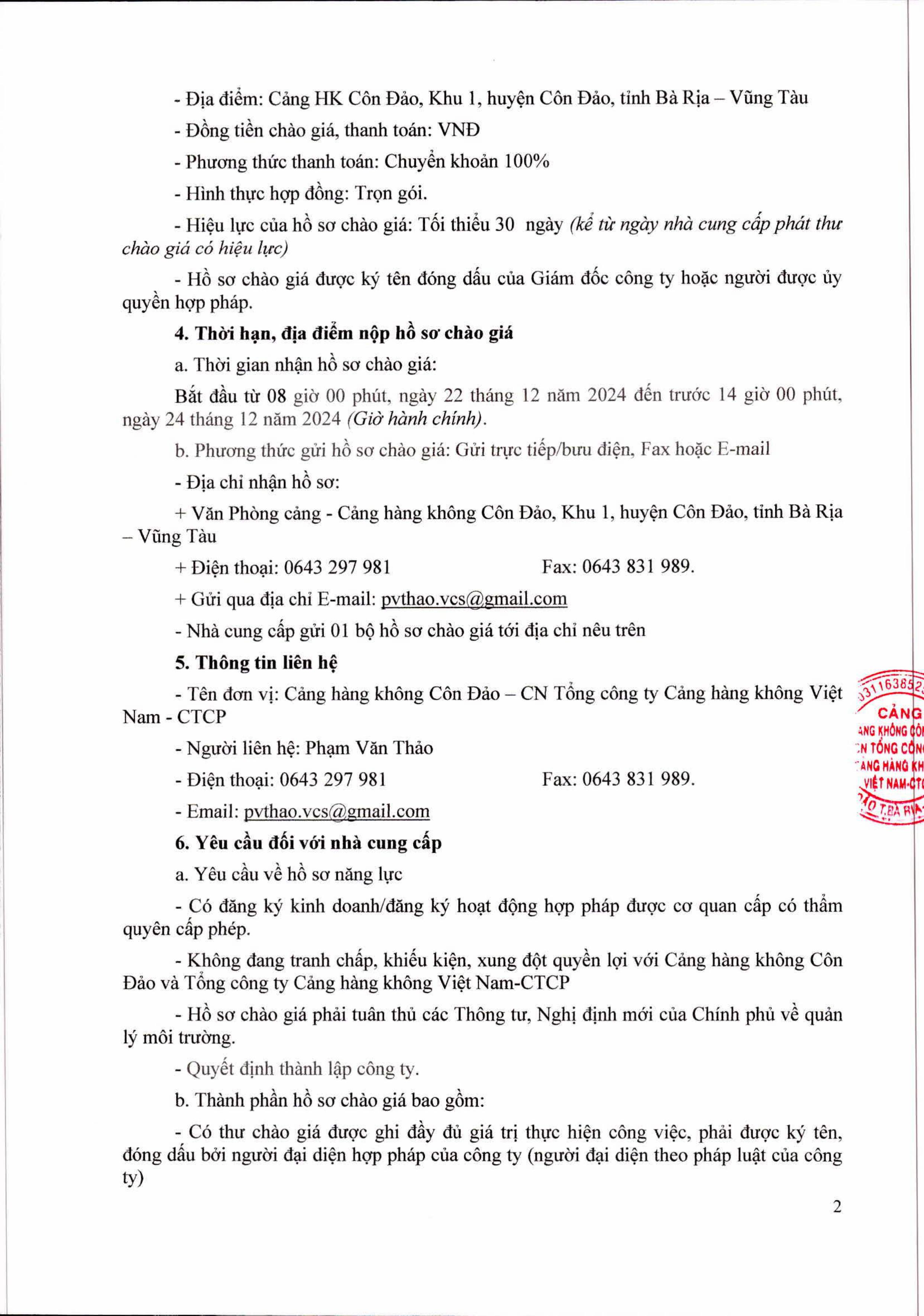 THÔNG BÁO MỜI CHÀO GIÁ (Lần 2) Về việc: "Cung cấp dịch vụ thu gom, vận chuyển và xử lý chất thải nguy hại tại Cảng hàng không Côn Đảo"