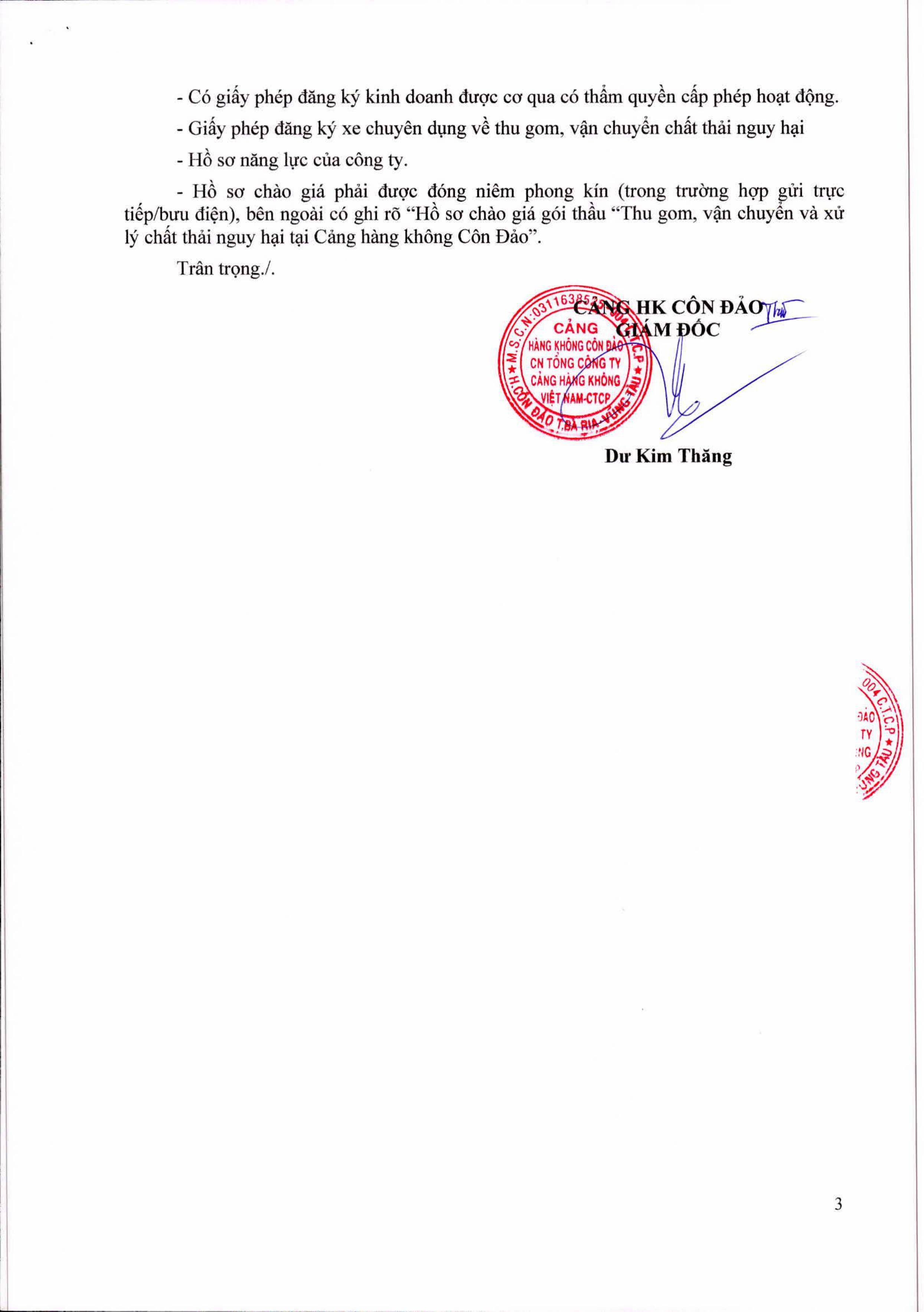 THÔNG BÁO MỜI CHÀO GIÁ (Lần 3) Về việc: "Cung cấp dịch vụ thu gom, vận chuyển và xử lý chất thải nguy hại tại Cảng hàng không Côn Đảo"