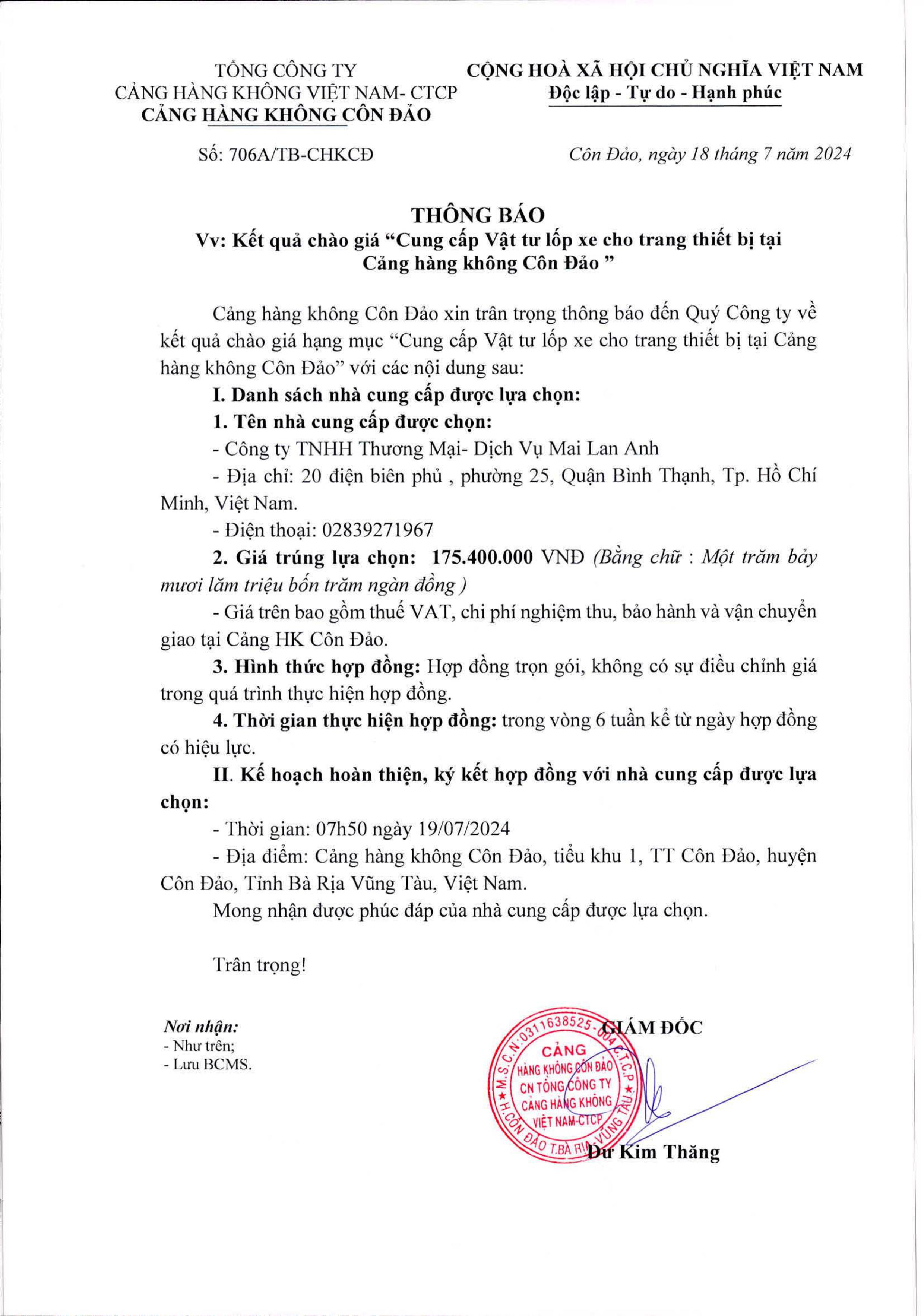 THÔNG BÁO V/v: Kết quả chào giá "Cung cấp Vật tư lốp xe cho trang thiết bị tại Cảng hàng không Côn Đảo