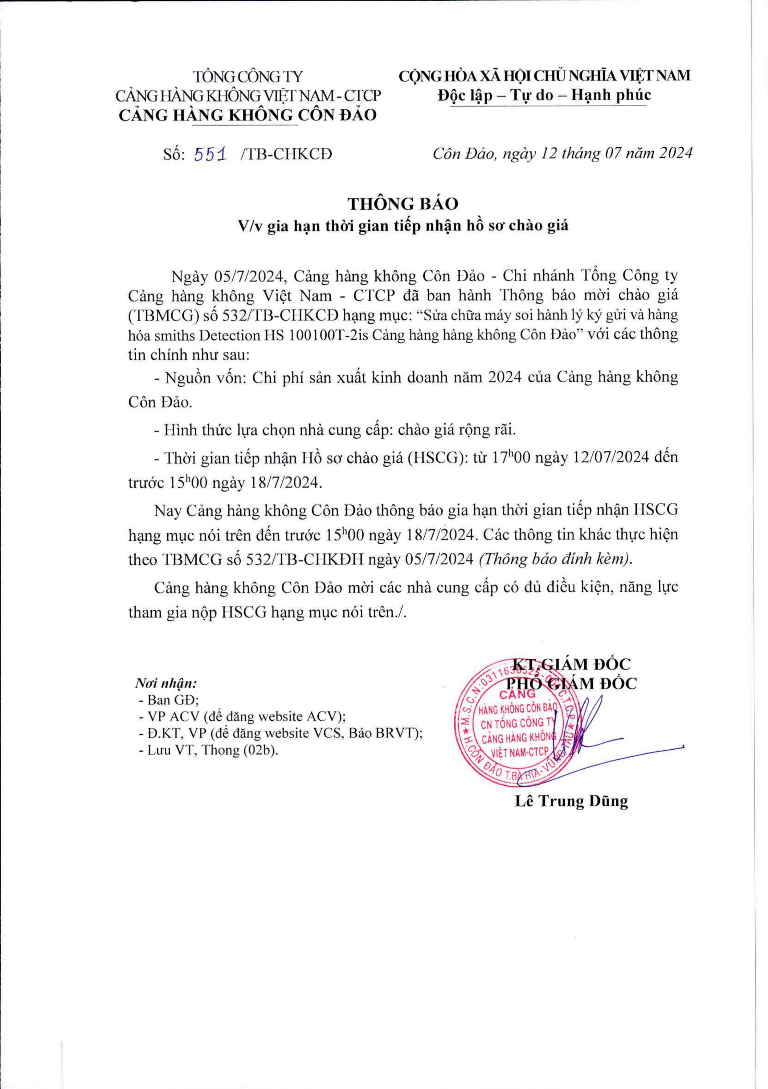 Thông báo V/v: kết quả chào giá "Cung cấp dịch vụ thu gom, vận chuyển và xử lý chất thải nguy hại tại Cảng hàng không Côn Đảo"