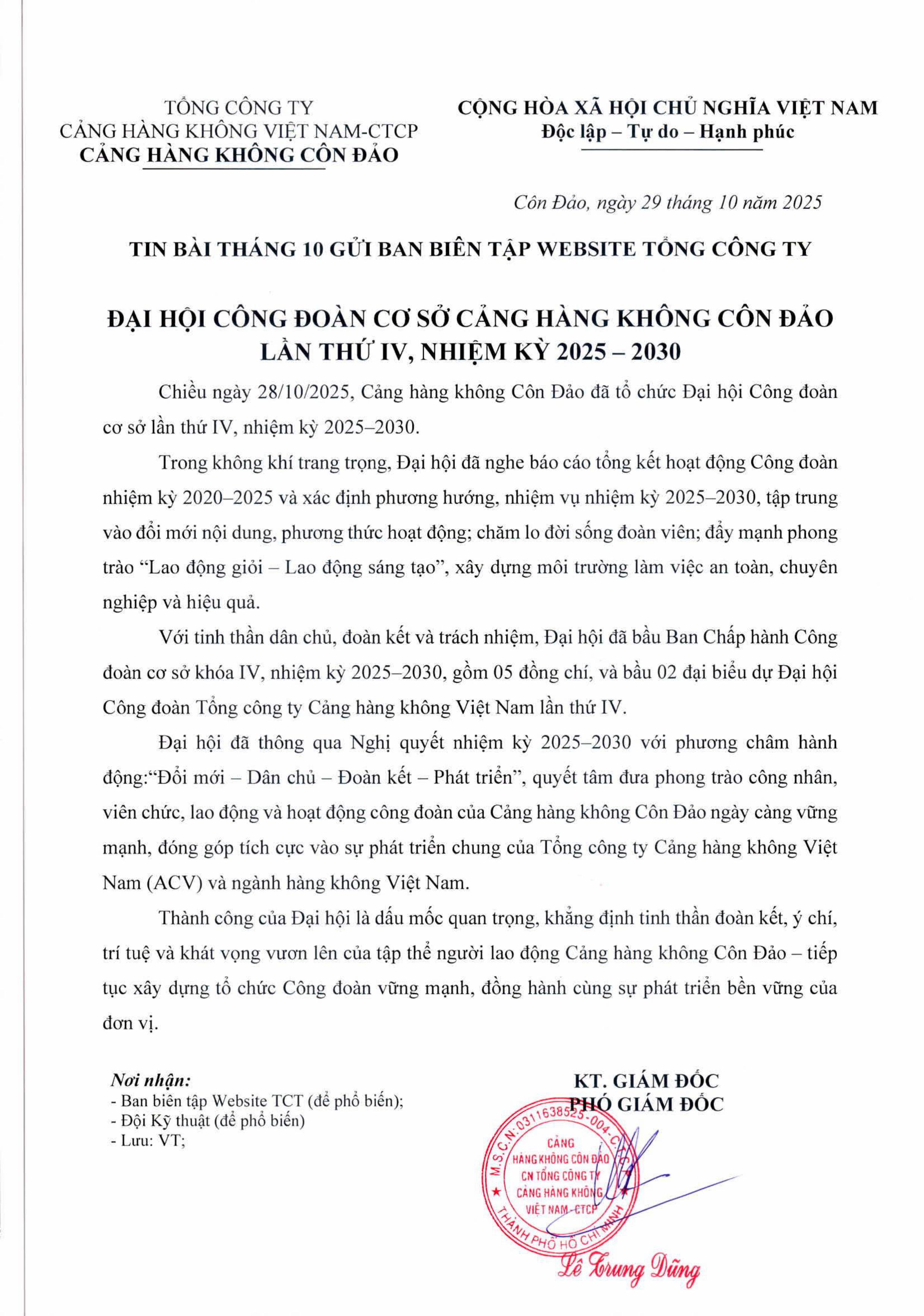 ĐẠI HỘI CÔNG ĐOÀN CƠ SỞ CẢNG HÀNG KHÔNG CÔN ĐẢO LẦN THỨ IV, NHIỆM KỲ 2025-2030
