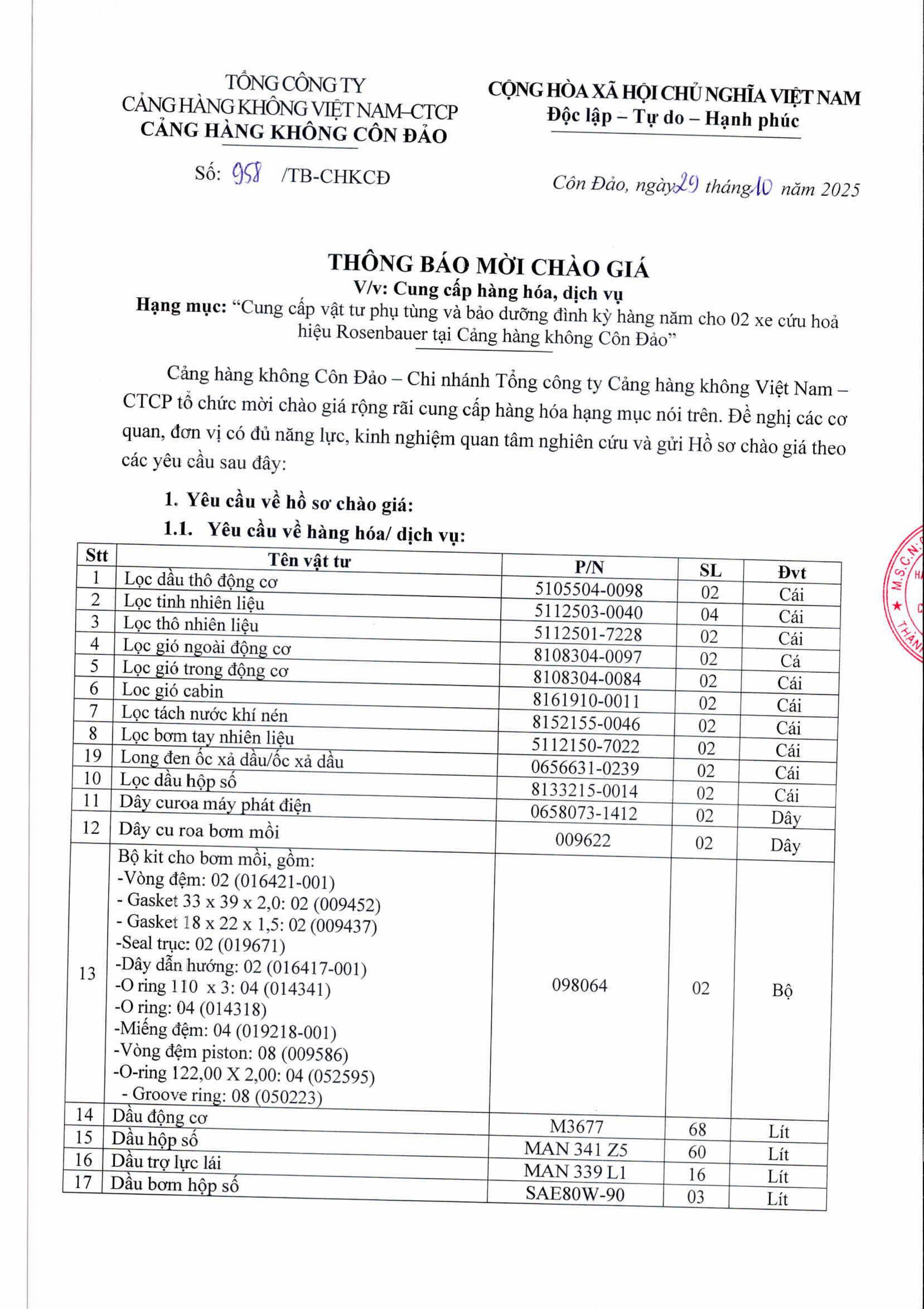 THÔNG BÁO MỜI CHÀO GIÁ V/V: CUNG CẤP VẬT TƯ PHỤ TÙNG VÀ BẢO DƯỠNG ĐỊNH KỲ HÀNG NĂM CHO 02 XE CỨU HỎA HIỆU ROSENBAUER TẠI CẢNG HÀNG KHÔNG CÔN ĐẢO