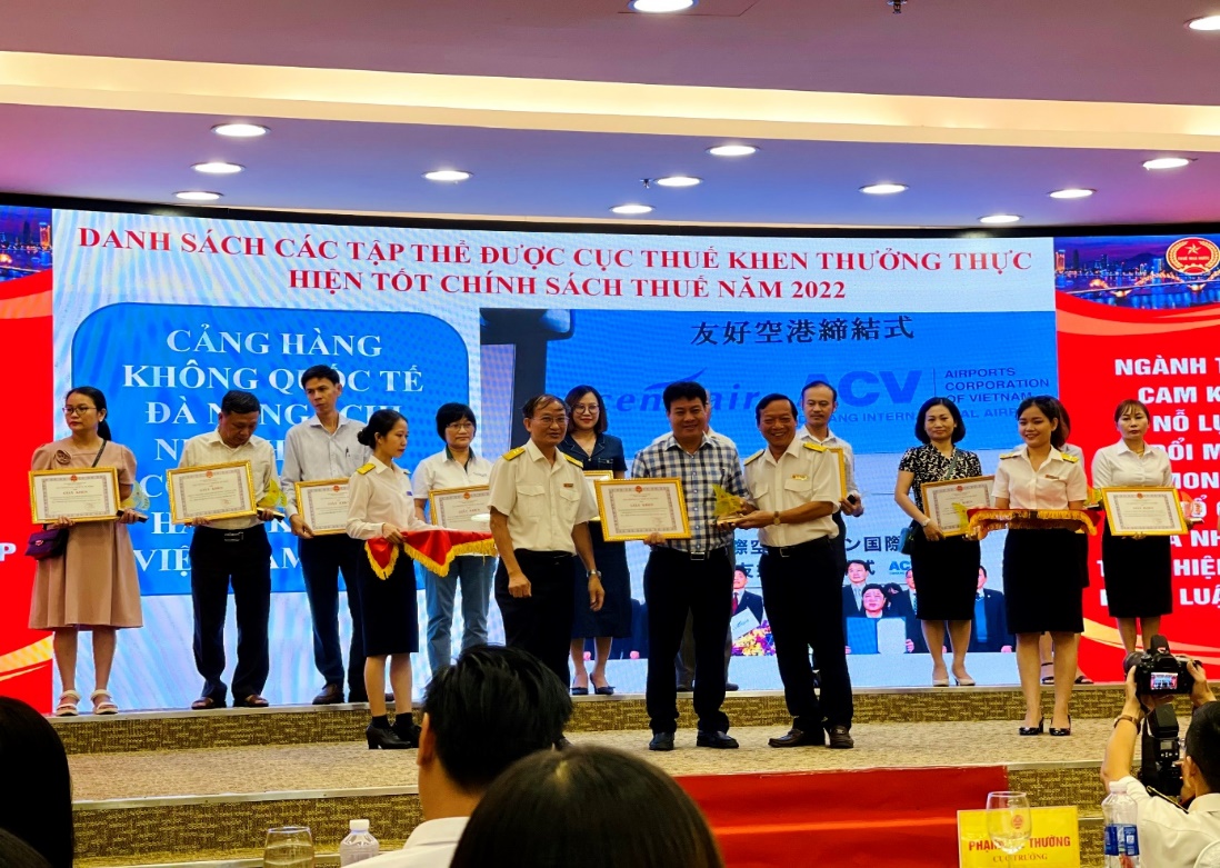 Trước đó, ngày 10/08/2023 tại Hội nghị tuyên dương khen thưởng Người nộp thuế thực hiện tốt chính sách thuế năm 2022, Cảng hàng không Quốc tế Đà Nẵng cũng đã vinh dự nhận Giấy khen của Cục thuế Thành phố Đà Nẵng vì đã có thành tích thực hiện tốt chính sách pháp luật về thuế, đóng góp to lớn vào sự phát triển của thành phố trong năm 2022.