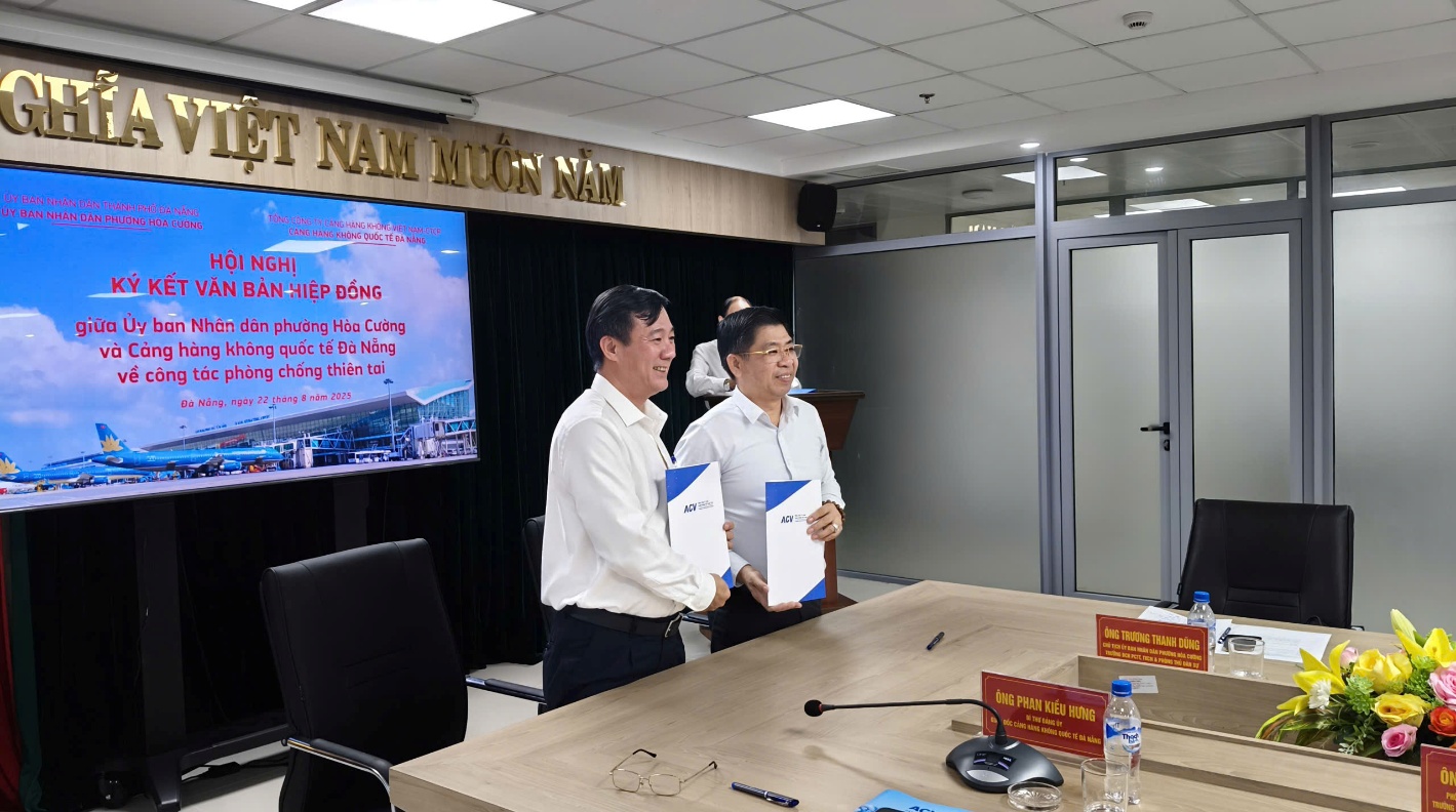 Ngày 22/8/2025, Cảng hàng không quốc tế Đà Nẵng và Ủy ban Nhân dân phường Hòa Cường thành phố Đà Nẵng đã tổ chức Hội nghị ký kết Văn bản Hiệp đồng về công tác Phòng chống Thiên tại tại Cảng hàng không quốc tế Đà Nẵng; Hội nghị đã diễn ra và thành công tốt đẹp. Hội nghị có sự tham dự của ông Trương Thanh Dũng - Chủ tịch Ủy ban Nhân dân phường Hòa Cường - Trưởng BCH PCTT, TKCN & Phòng thủ dân sự và ông Phan Kiều Hưng - Bí thư Đảng ủy, Giám đốc Cảng hàng không quốc tế Đà Nẵng cùng đại diện lãnh đạo các cơ quan Quản lý Nhà nước, các đơn vị Công an và các cơ quan, đơn vị nghiệp vụ tham mưu của 02 đơn vị.