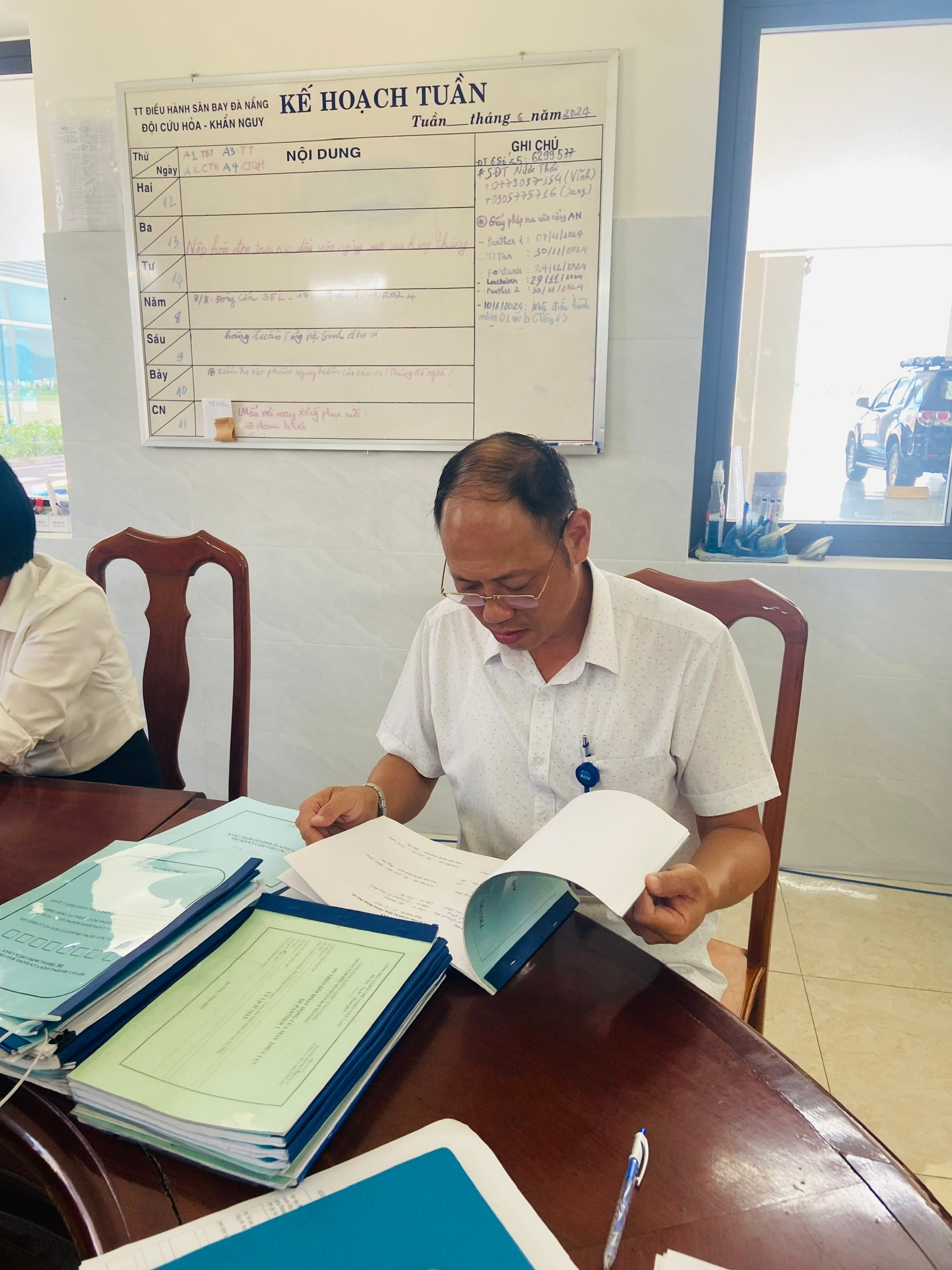 Ông Phạm Văn Thành - Thành viên đoàn kiểm tra ATVSLĐ của Cảng HKQTĐN đang kiểm tra hồ sơ An toàn phòng cháy chữa cháy tại P. trực đội Cứu hỏa khẩn nguy - Trạm Cứu hỏa số 2 thuộc Trung tâm Điều hành sân bay Đà Nẵng