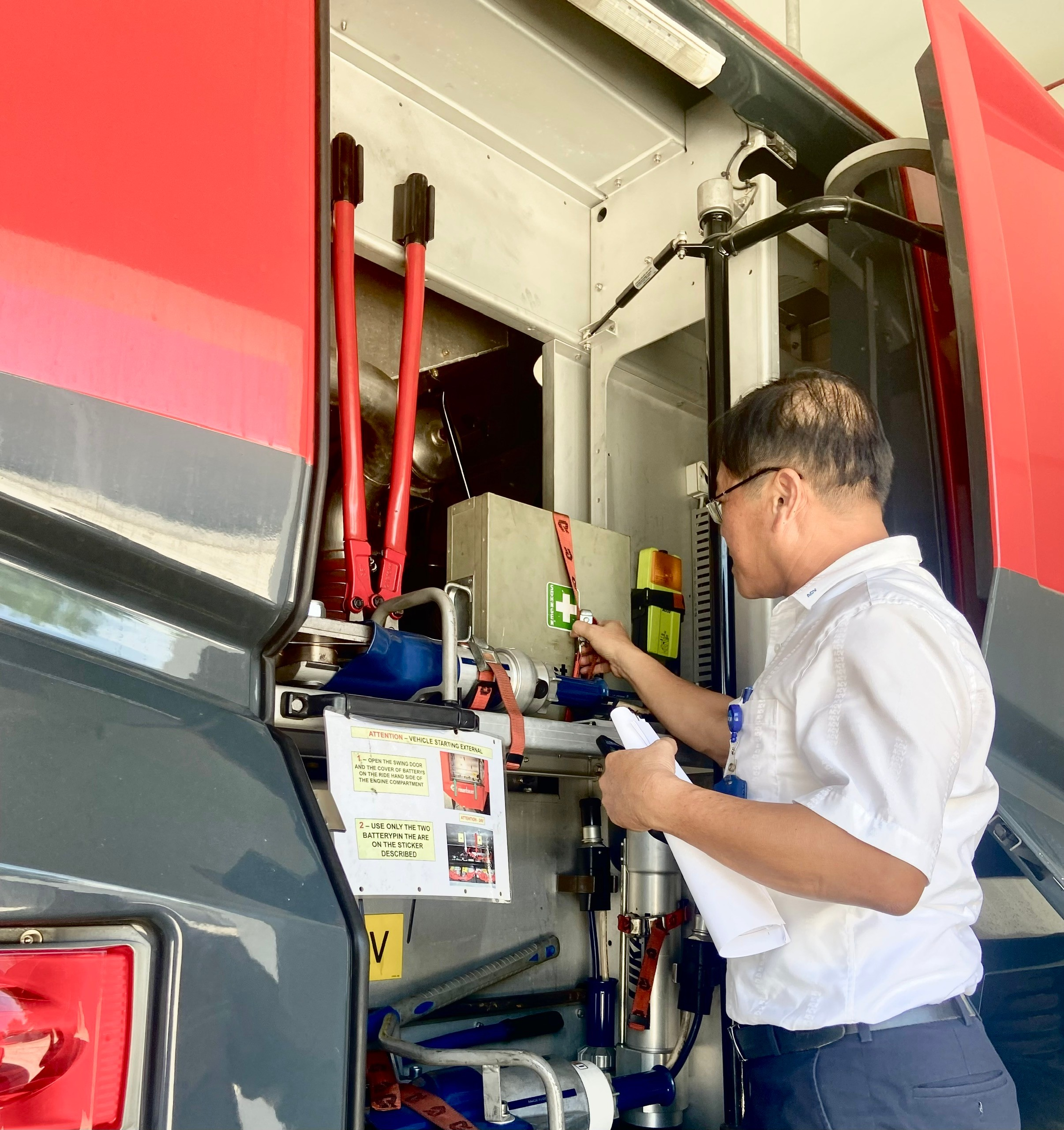 Ông Tạ Thanh Hải – Thành viên đoàn kiểm tra ATVSLĐ của Cảng HKQTĐN đang kiểm tra CCDC phục vụ cho sơ cấp cứu tại chỗ - Ảnh được chụp tại trạm Cứu hỏa số 2 thuộc Trung tâm Điều hành sân bay Đà Nẵng