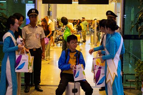 Tặng quà lưu niệm cho những vị khách đầu tiên trên chuyến bay