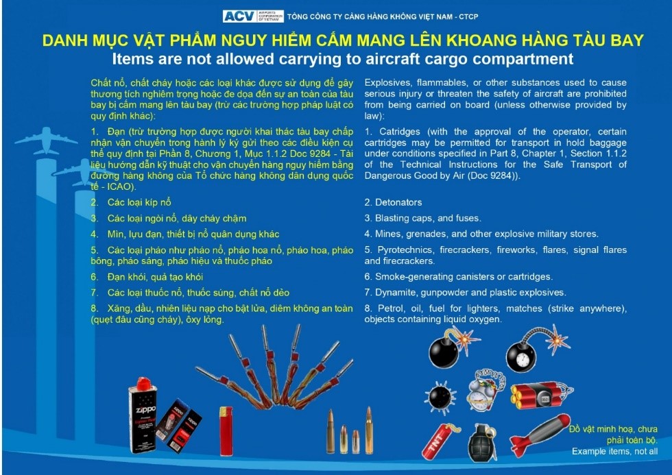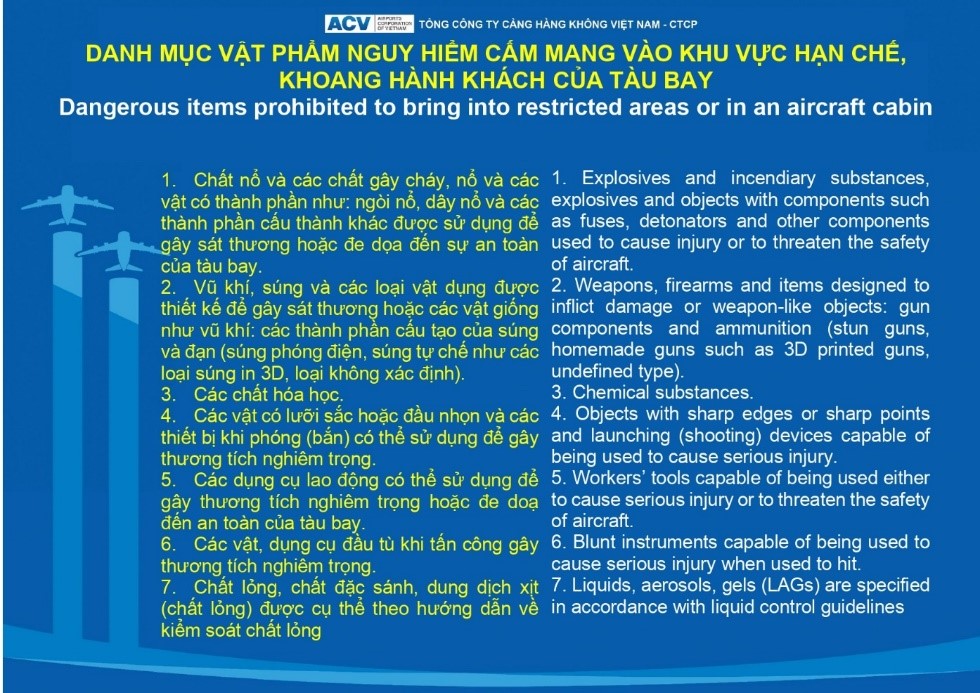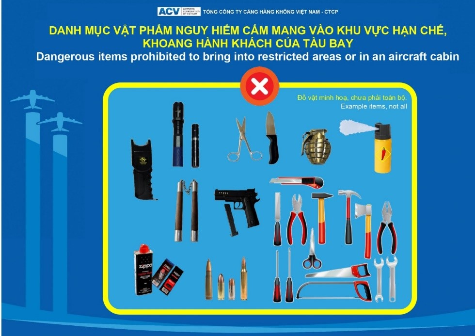 Chi tiết Danh mục vật phẩm nguy hiểm hạn chế mang theo người, hành lý lên tàu bay theo Quyết định số 1541/QĐ-CHK ngày 14/9/2021 của Cục trưởng Cục Hàng không Việt Nam tại file đính kèm ACV Trình chiếu 2025.pdf