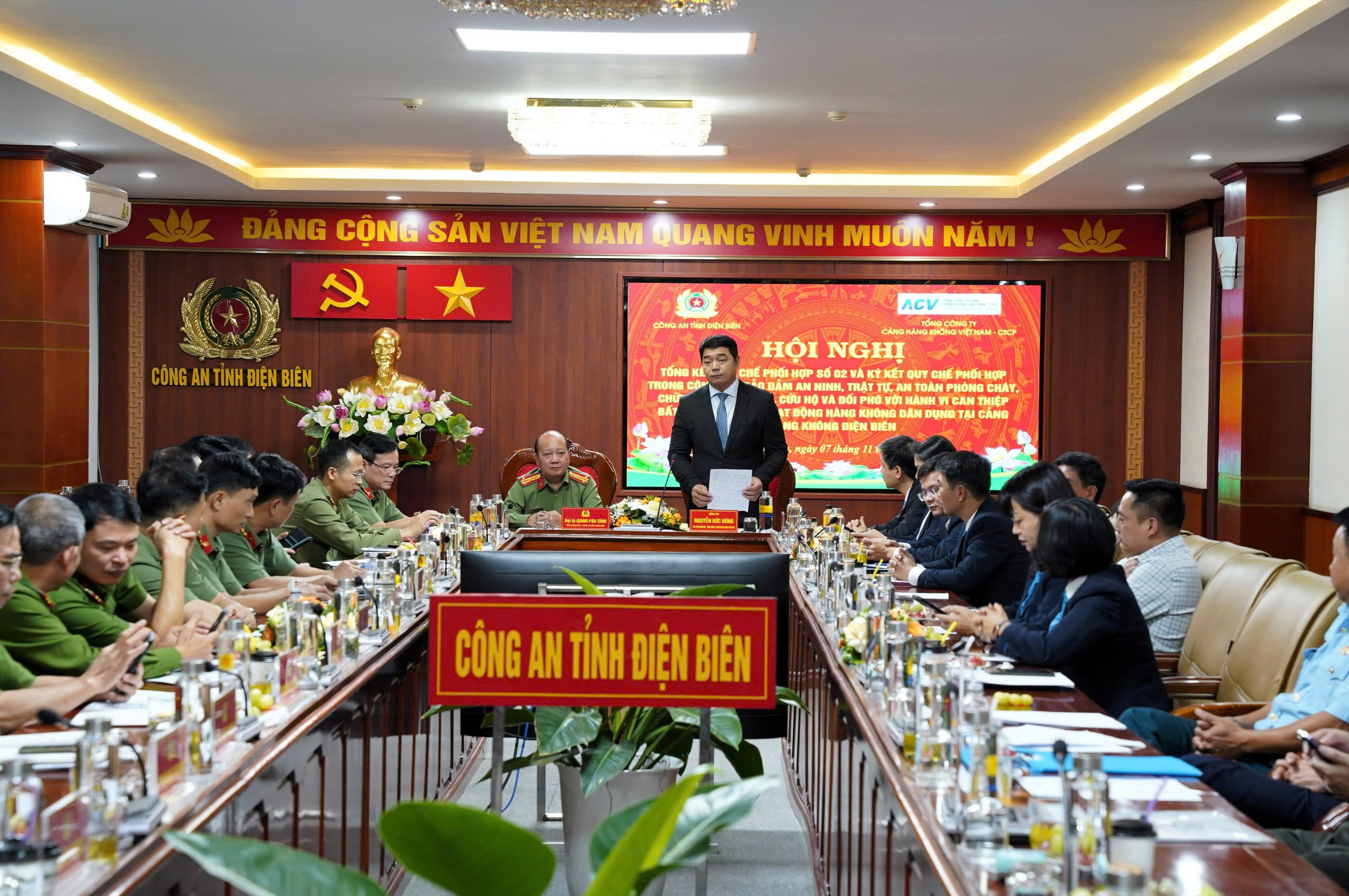 Tại hội nghị, Phó Tổng Giám đốc Nguyễn Đức Hùng thay mặt lãnh đạo Tổng công ty Cảng hàng không Việt Nam gửi lời cám ơn đến Công an tỉnh Điện Biên, các phòng ban công an tại tỉnh đã luôn ủng hộ, phối hợp, hỗ trợ Tổng công ty duy trì, giữ vững ổn định tình hình an ninh an toàn, an ninh trật tự, an toàn PCCC&CNCH tại Cảng Điện Biên. Bên cạnh đó, phối hợp tổ chức tuyên truyền, phổ biến các quy định của pháp luật về an ninh an toàn hàng không cho bà con sinh sống quanh khu vực vành đai Cảng; chỉ đạo các phòng nghiệp vụ có liên quan phối hợp, tạo điều kiện giúp Cảng HK Điện Biên tổ chức huấn luyện, nâng cao chuyên môn nghiệp vụ cho lực lượng an ninh hàng không tại Cảng.