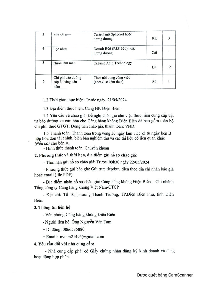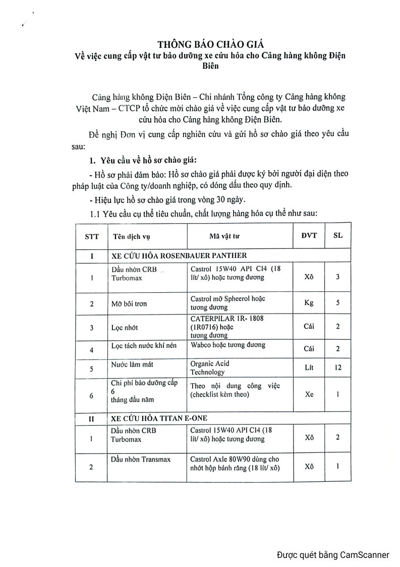 Thông báo chào giá Về việc cung cấp vật tư bảo dưỡng xe cứu hỏa cho Cảng hàng không Điện Biên