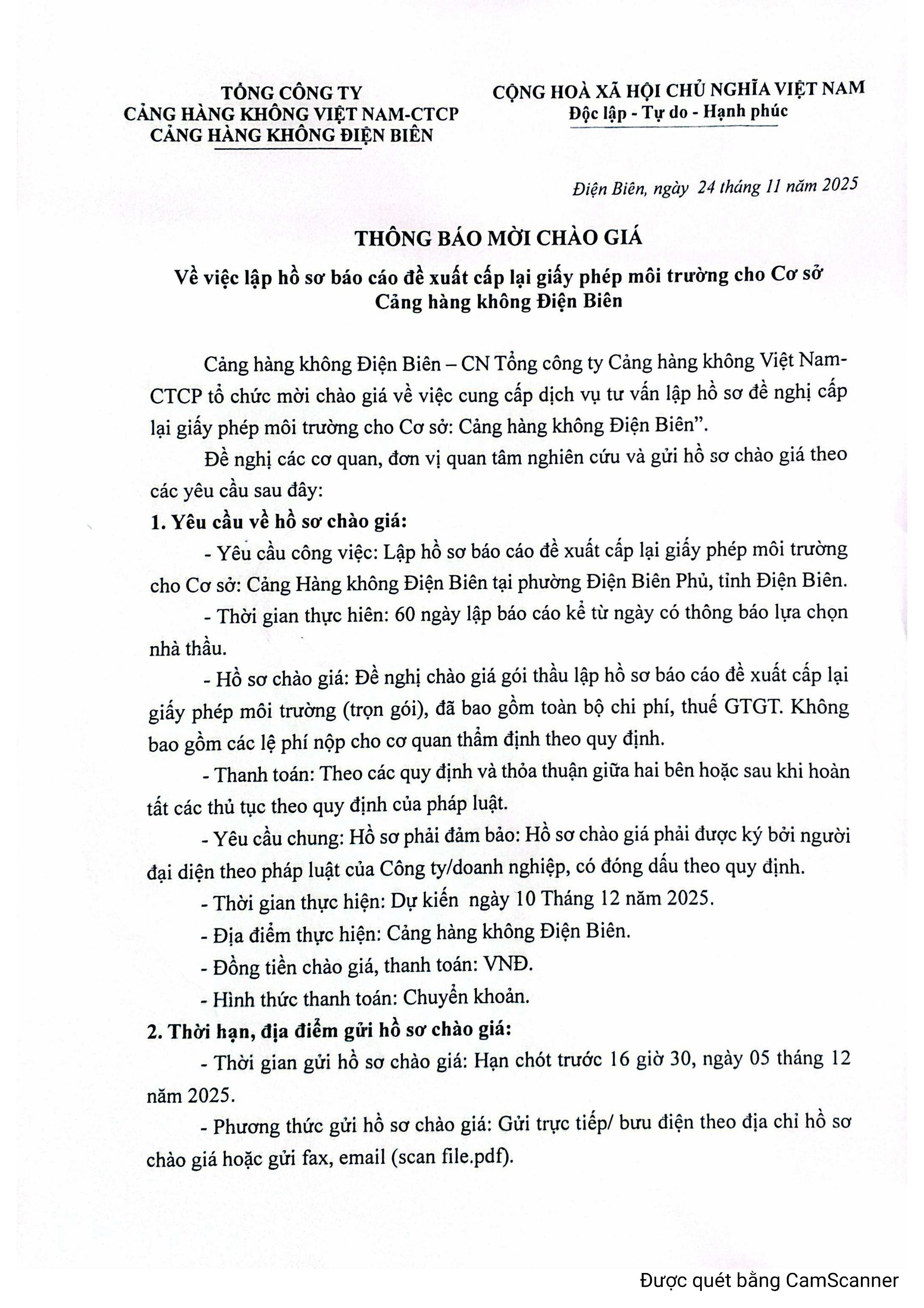 Thông báo chào giá về việc lập hồ sơ báo cáo đề xuất cấp lại giấy phép môi trường cho Cơ sở Cảng hàng không Điện Biên