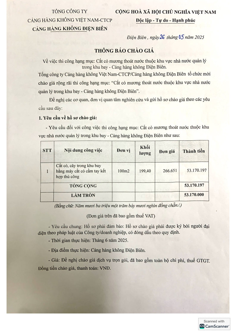 Thông báo chào giá về việc thi công hạng mục: Cắt cỏ mương thoát nước thuộc khu vực nhà nước quản lý trong khu bay - Cảng hàng không Điện Biên