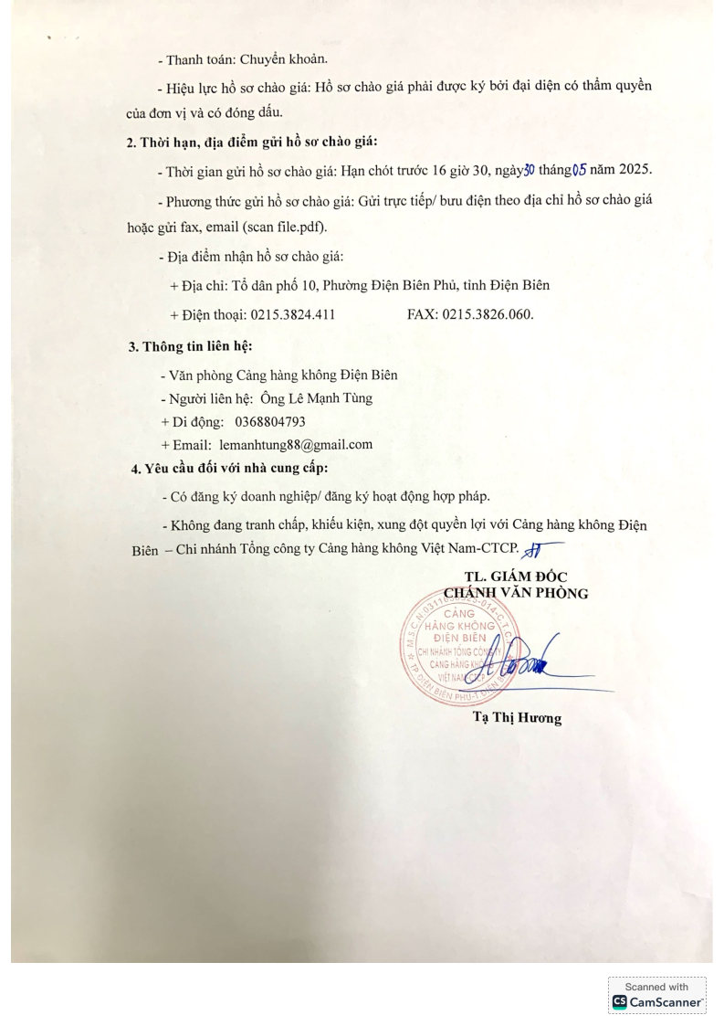 Thông báo chào giá về việc lập hồ sơ báo cáo đề xuất cấp lại giấy phép môi trường cho Cơ sở Cảng hàng không Điện Biên