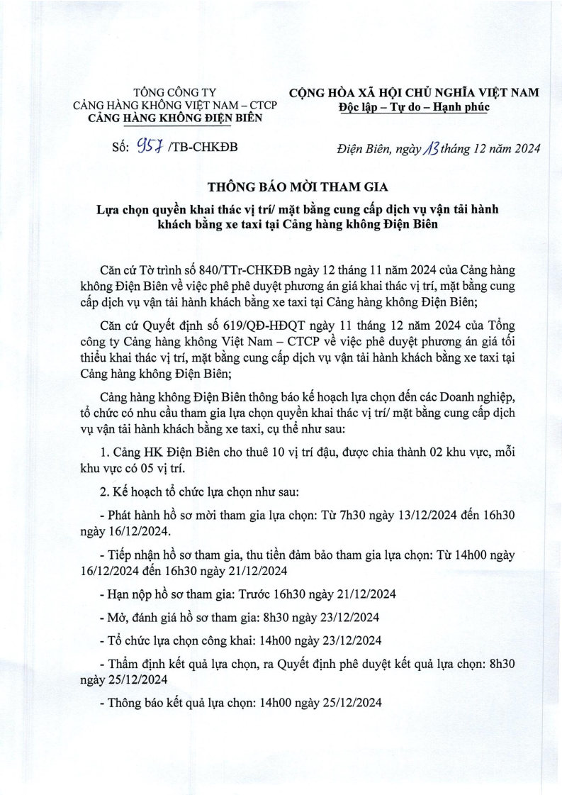 Thông báo mời tham gia lựa chọn quyền khai thác vị trí, mặt bằng cung cấp dịch vụ vận tải hành khách bằng xe taxi tại Cảng hàng không Điện Biên