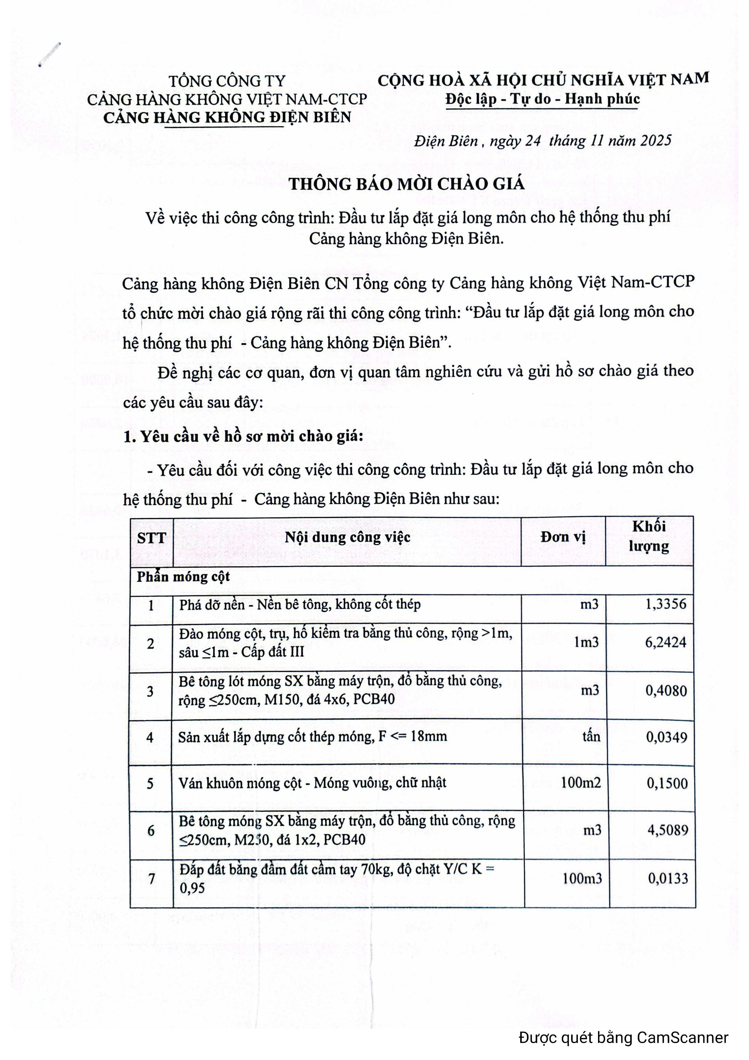 Thông báo chào giá về việc thi công công trình: Đầu tư lắp đặt giá long môn cho hệ thống thu phí Cảng hàng không Điện Biên
