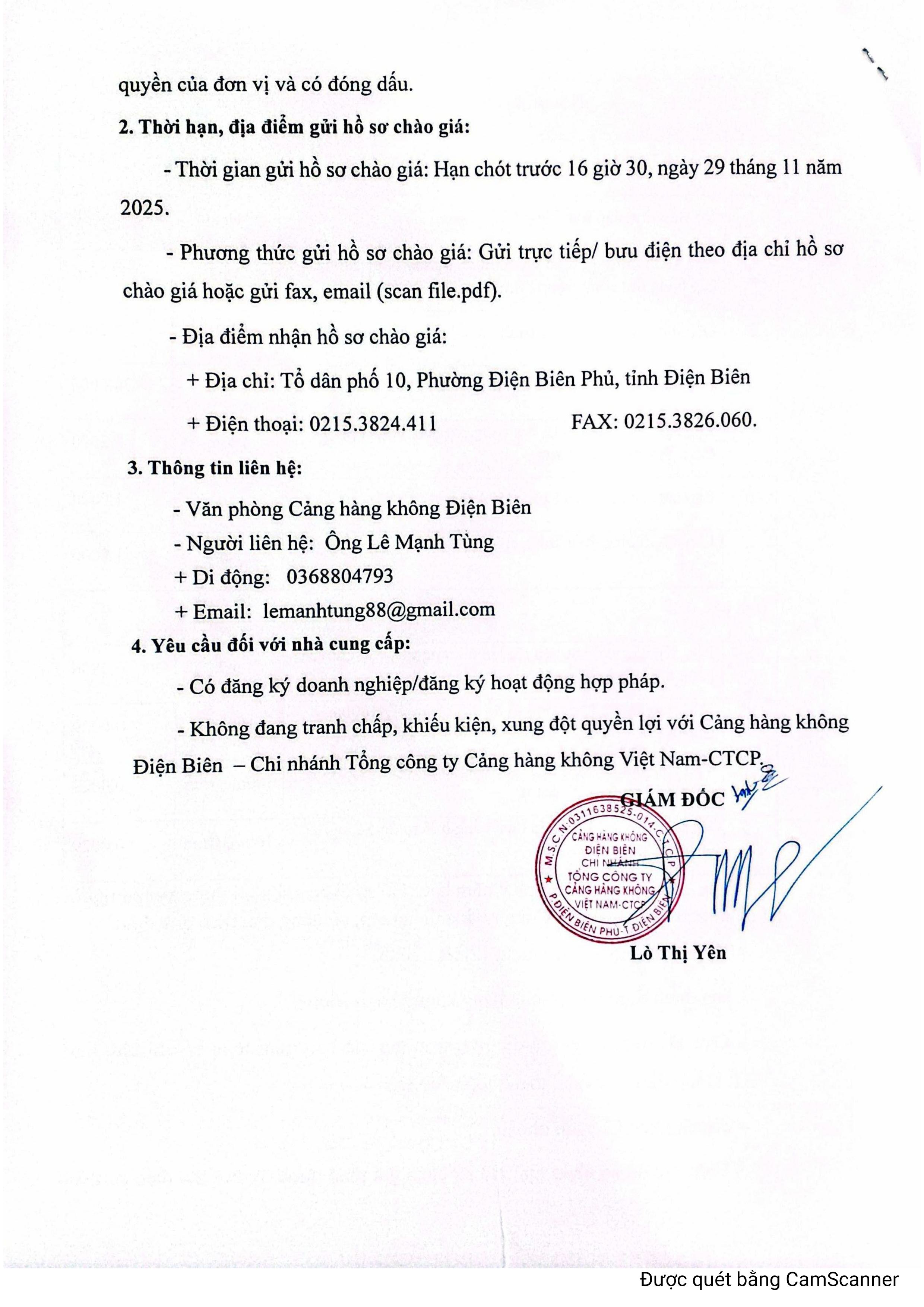 Thông báo chào giá về việc lập hồ sơ báo cáo đề xuất cấp lại giấy phép môi trường cho Cơ sở Cảng hàng không Điện Biên