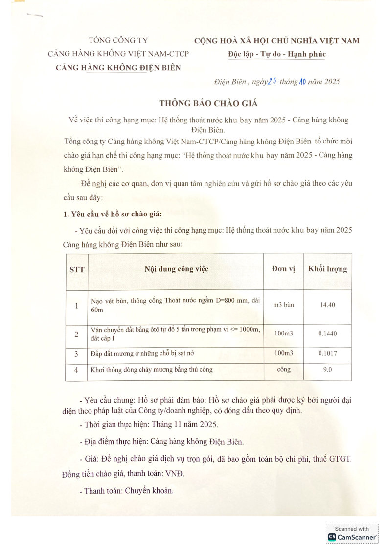 Thông báo chào giá về việc thi công hạng mục: Hệ thống thoát nước khu bay năm 2025 - Cảng hàng không Điện Biên
