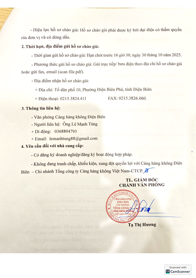 Thông báo chào giá về việc lập hồ sơ báo cáo đề xuất cấp lại giấy phép môi trường cho Cơ sở Cảng hàng không Điện Biên