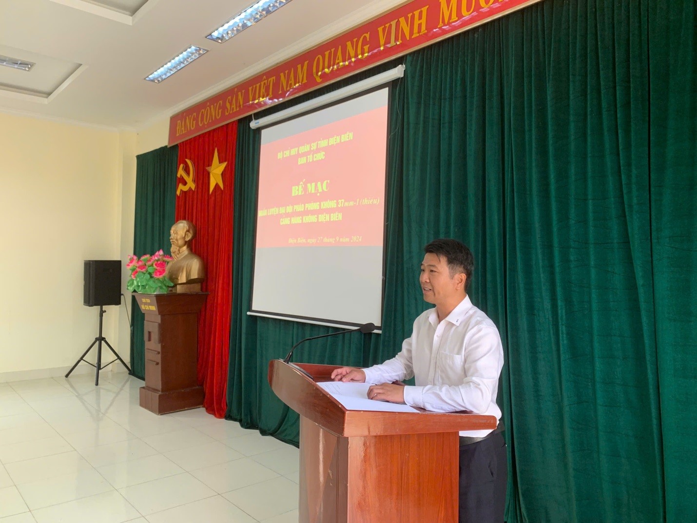 Đồng chí Trần Văn Hồng- Chỉ huy trưởng BCHQS Cảng HK Điện Biên phát biểu tại lễ Bế mạc huấn luyện đội pháo phòng không 37mm-1