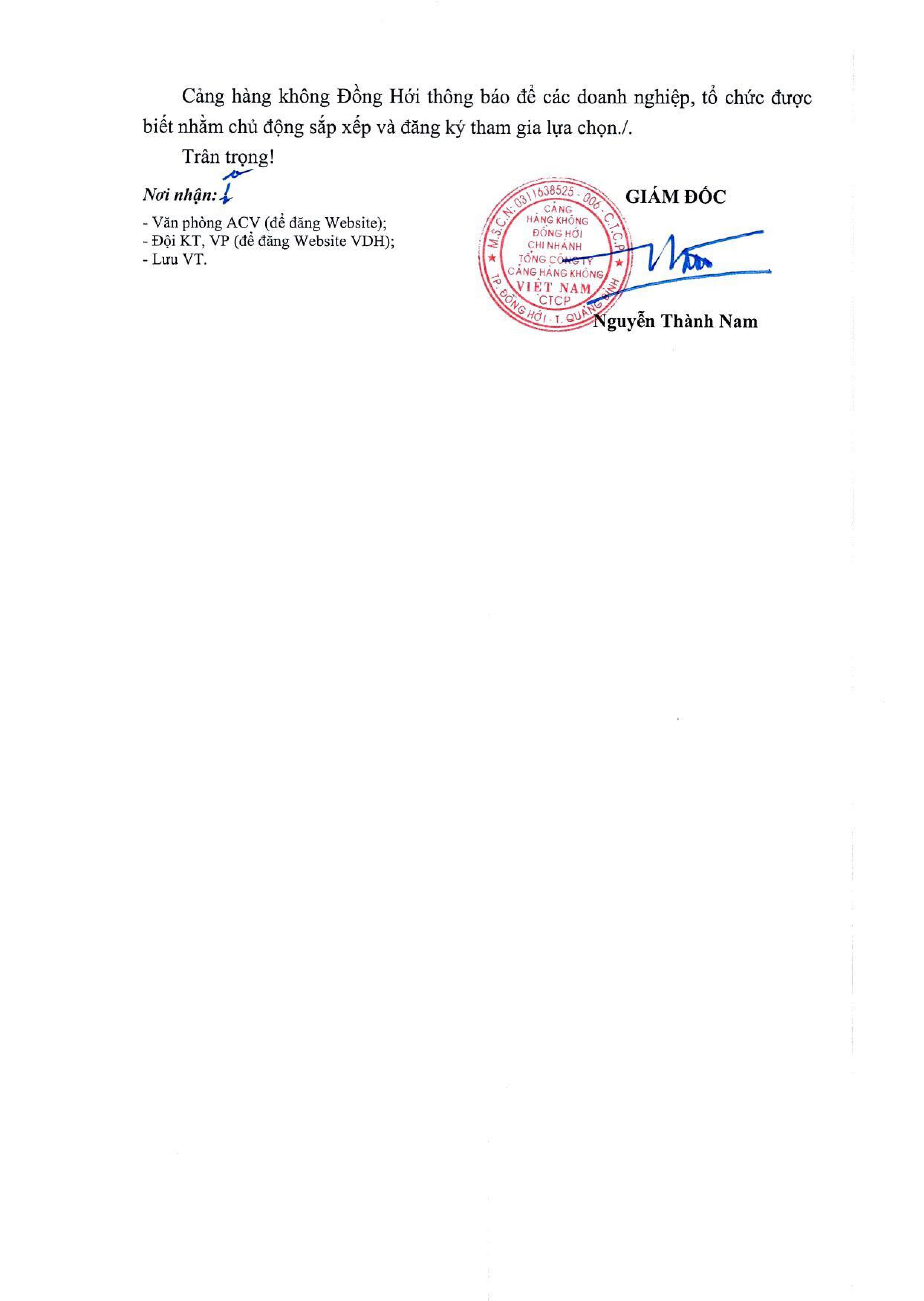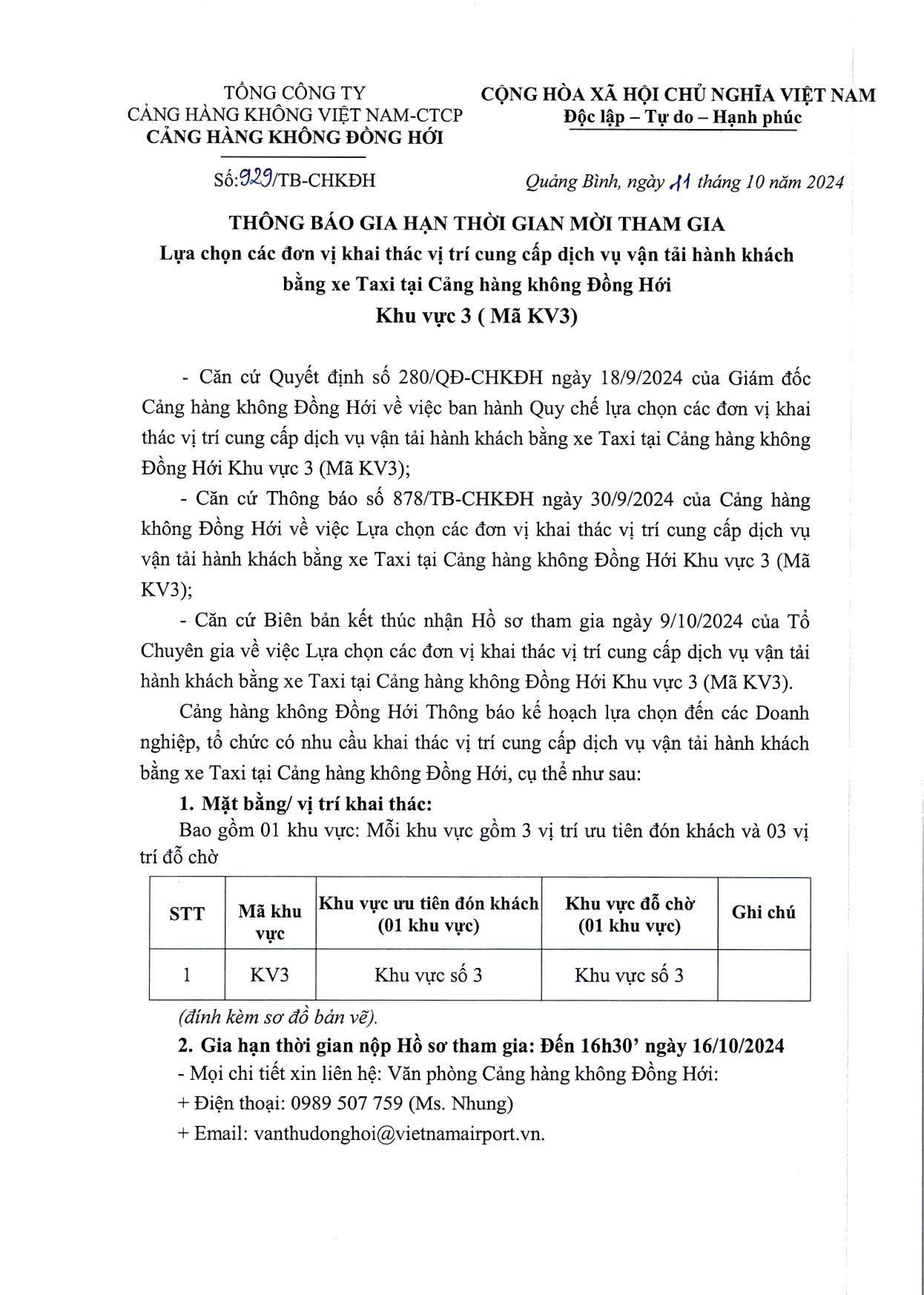 Thông báo gia hạn thời gian mời tham gia lựa chọn các đơn vị khai thác vị trí cung cấp dịch vụ vận tải hành khách bằng taxi tại cảng hàng không Đồng Hới khu vực 3 (Mã KV3)