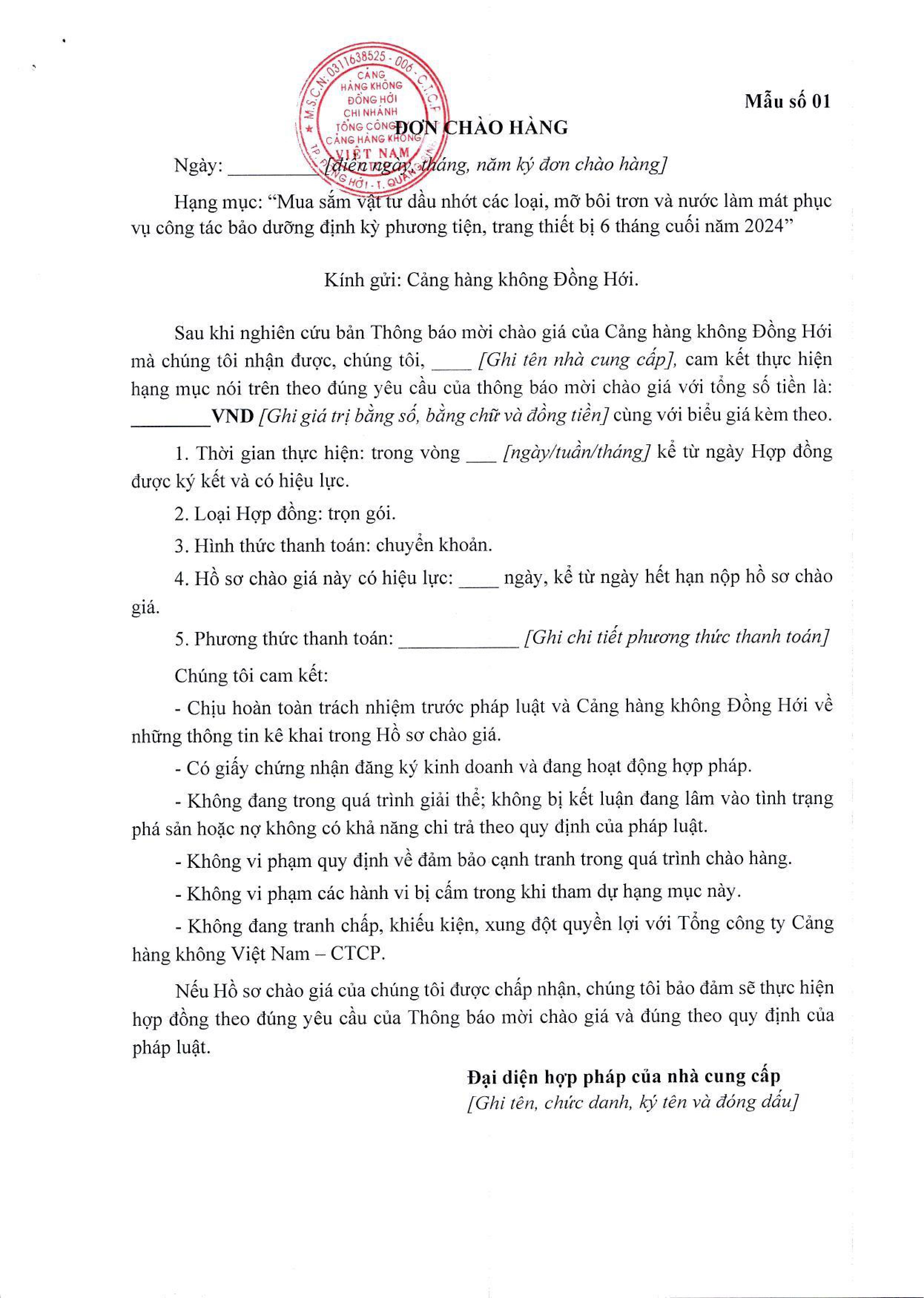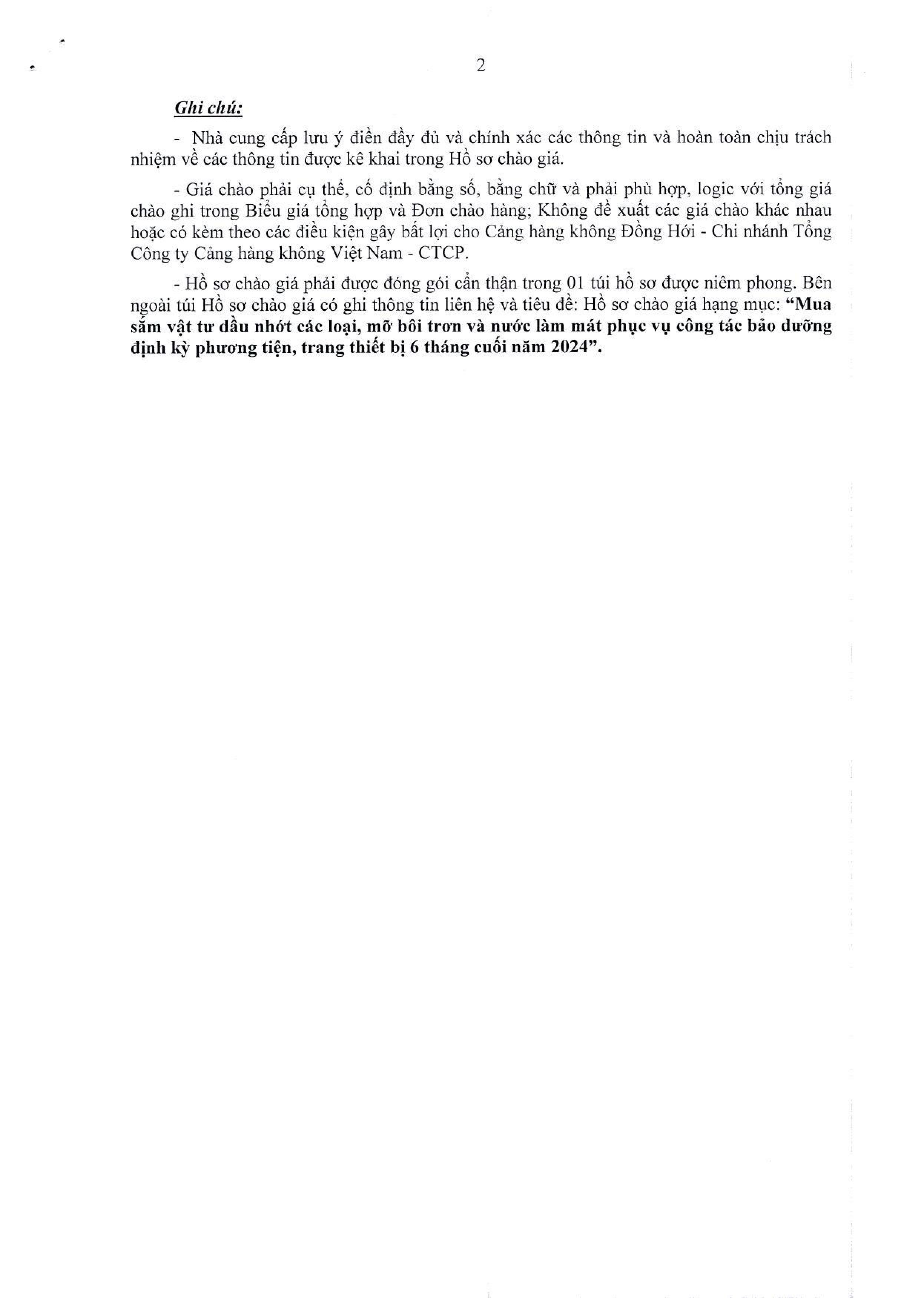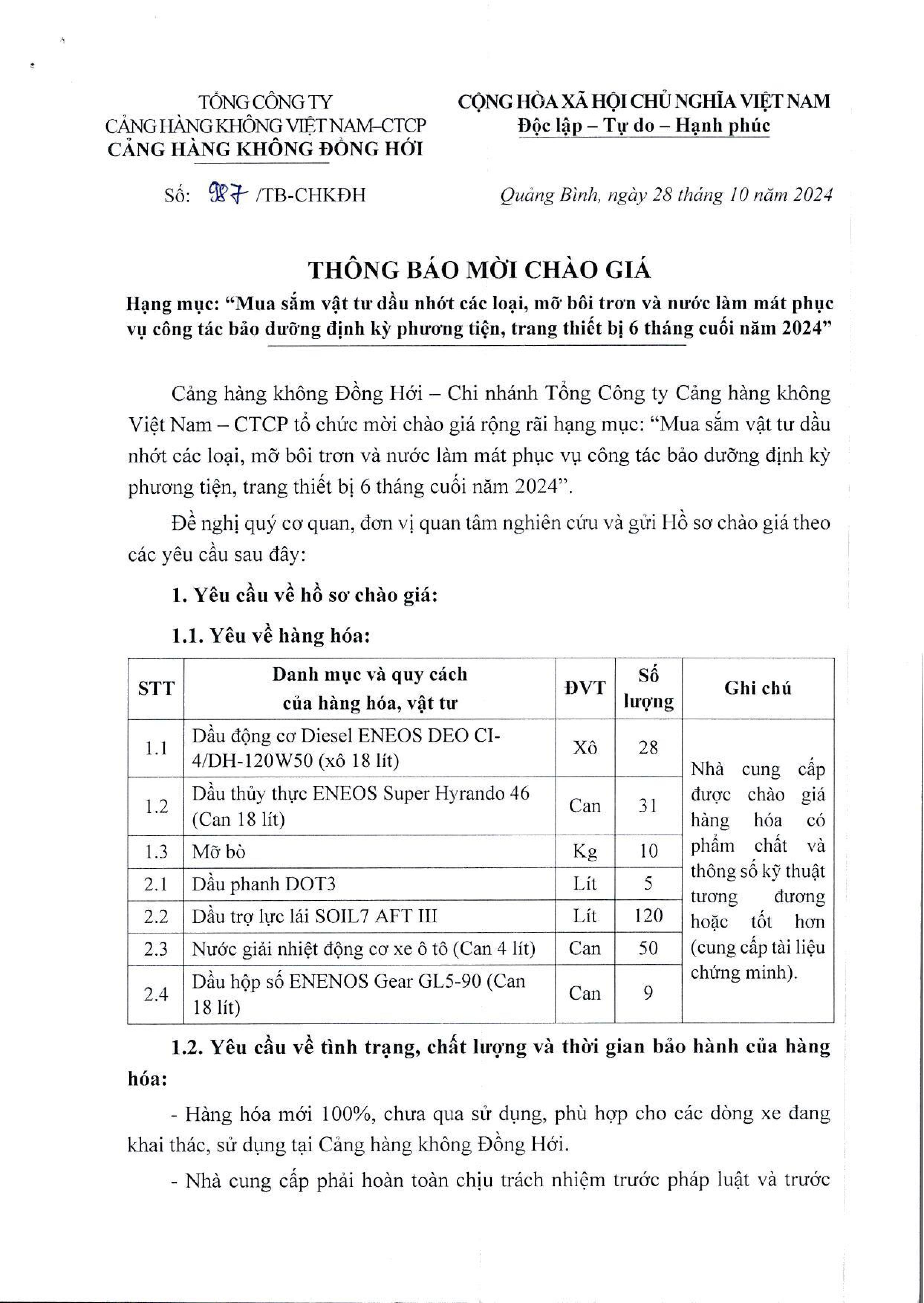 THÔNG BÁO MỜI CHÀO GIÁ Hạng mục: " Mua sắm vật tư dầu nhớt các loại, mỡ bôi trơn và nước làm mát phục vụ công tác bảo dưỡng định kỳ phương tiện, trang thiết bị 6 tháng cuối năm 2024"