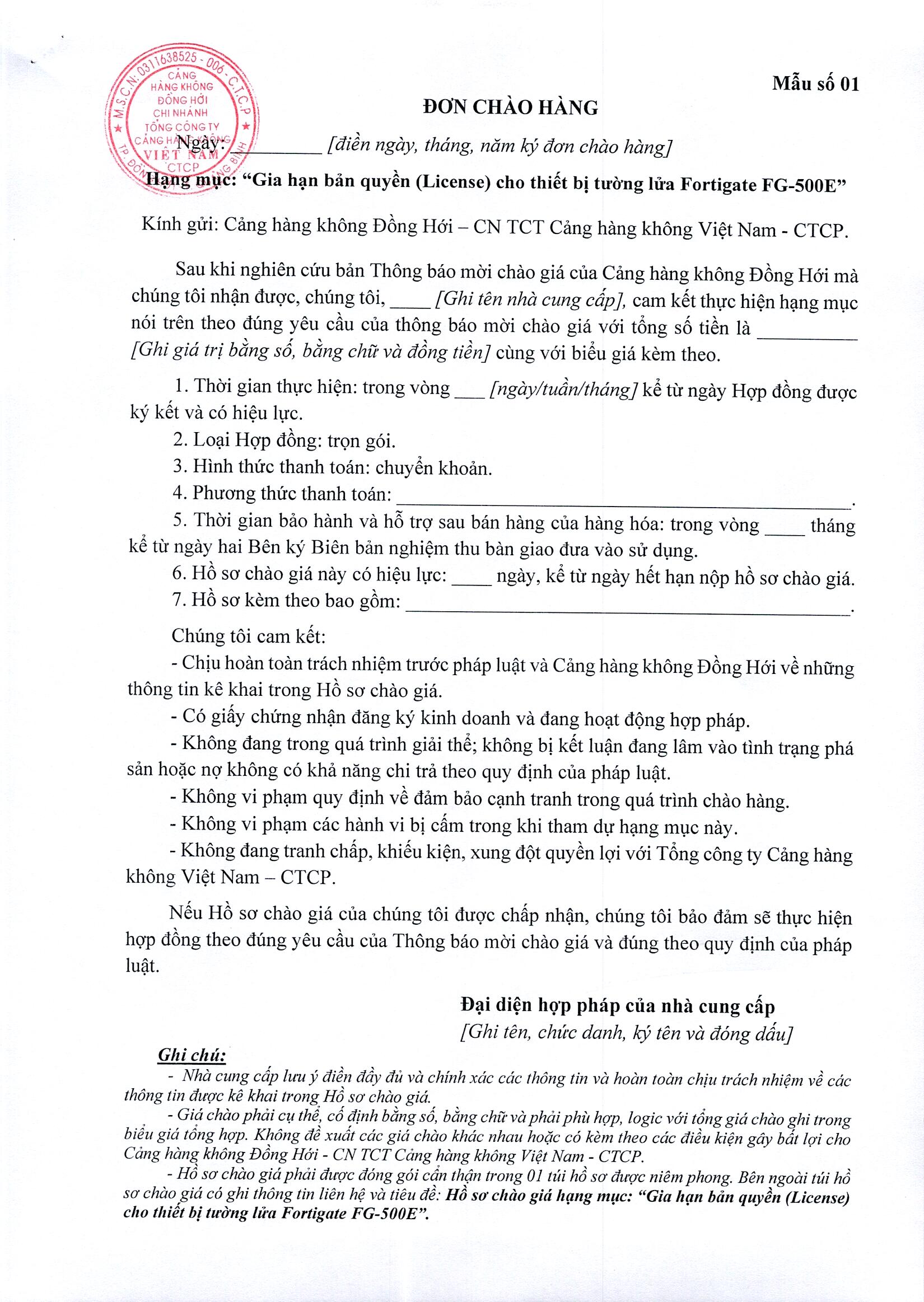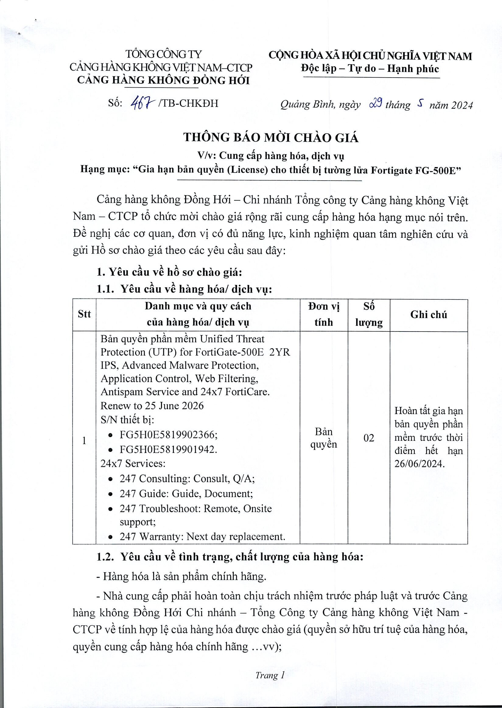 THÔNG BÁO MỜI CHÀO GIÁ V/v: Cung cấp hàng hóa, dịch vụ Hạng mục : " Gia hạn bản quyền (License) cho thiết bị tường lửa Fortigate FG- 500"