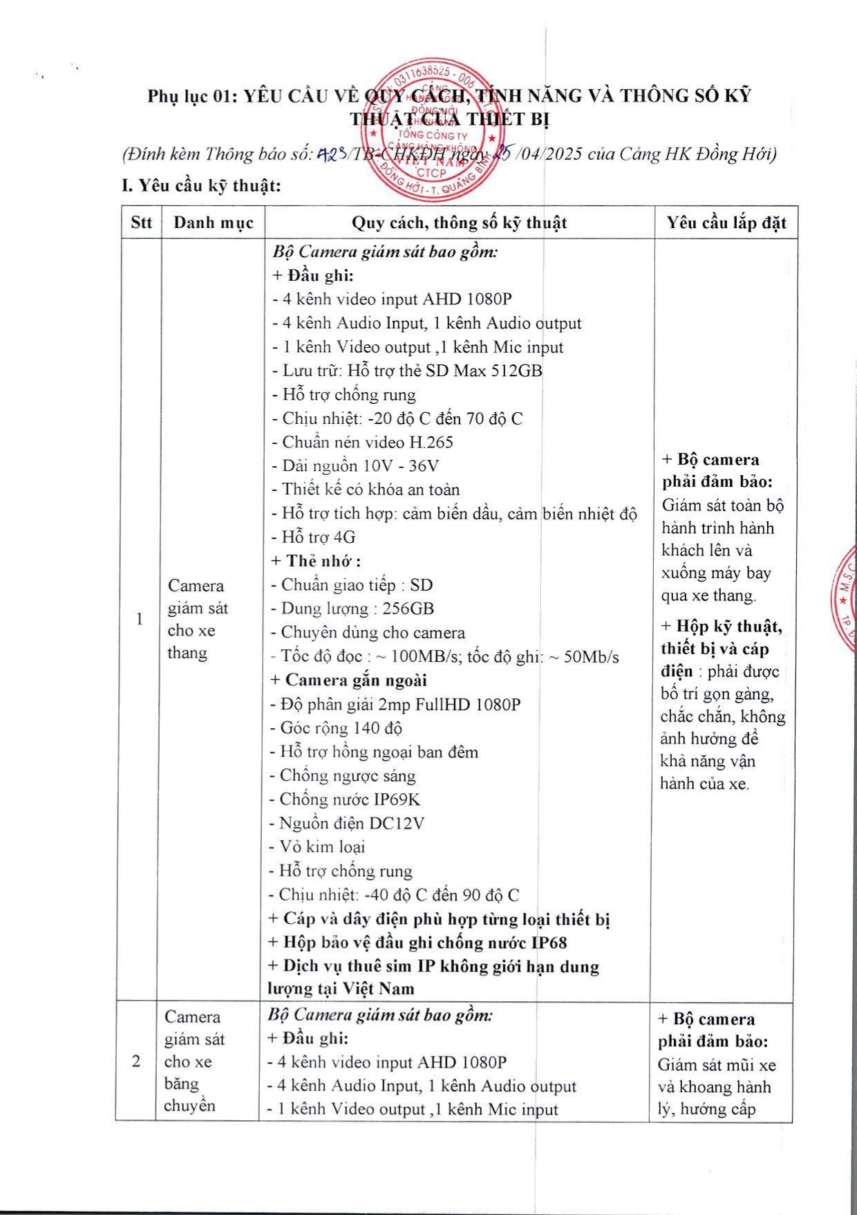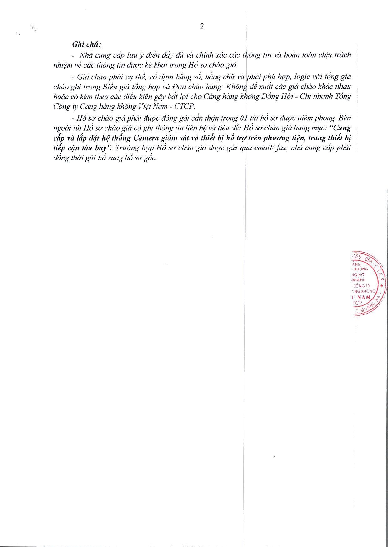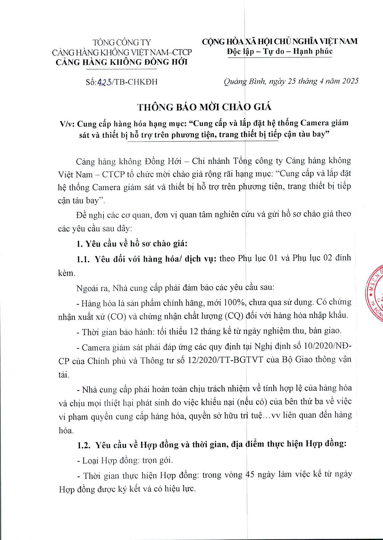 THÔNG BÁO MỜI CHÀO GIÁ V/v: Cung cấp hàng hoá hạng mục: " Cung cấp và lắp đặt hệ thống Camera giám sát và thiết bị hỗ trợ trên phương tiện, trang thiết bị tiếp cận tàu bay"