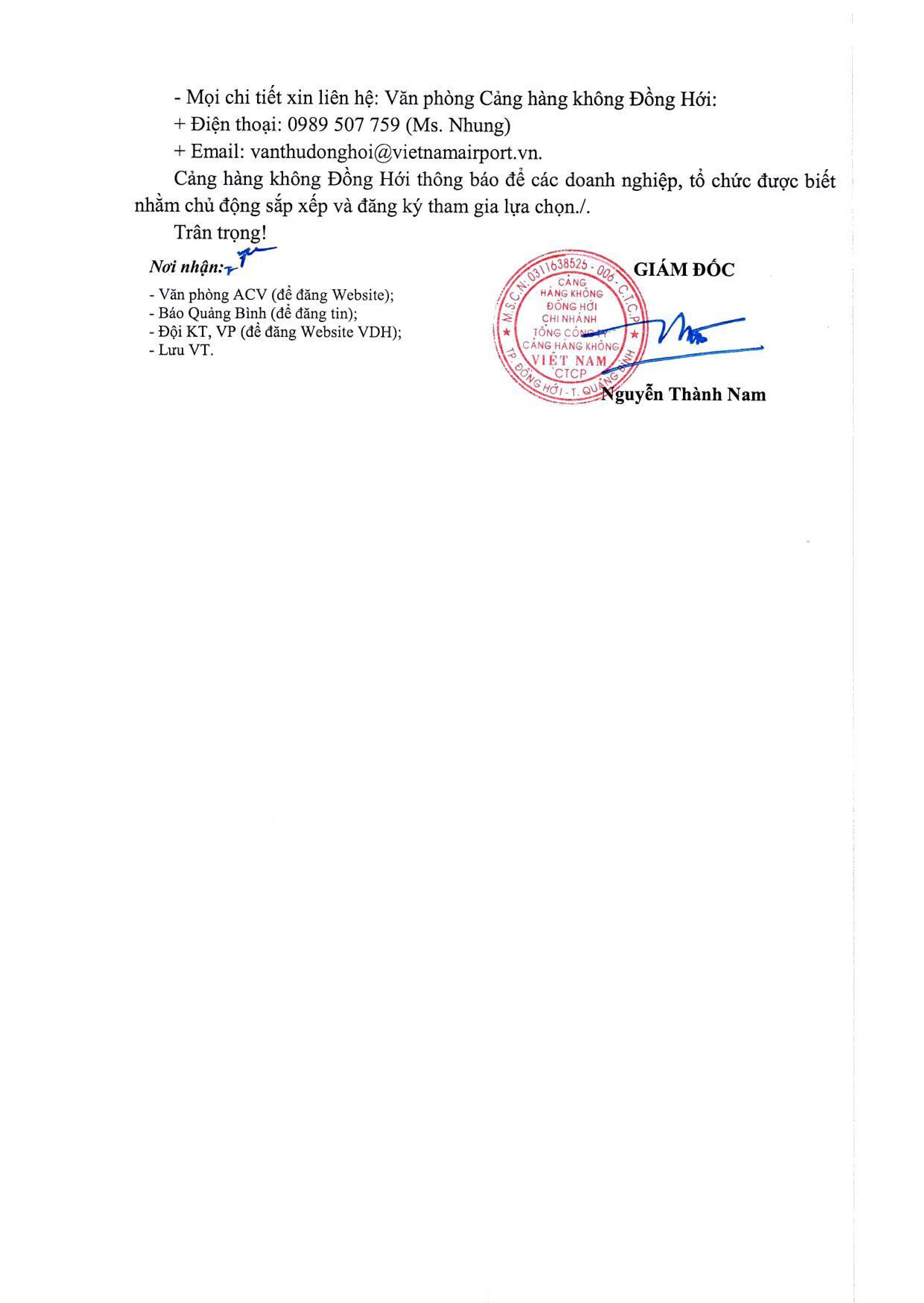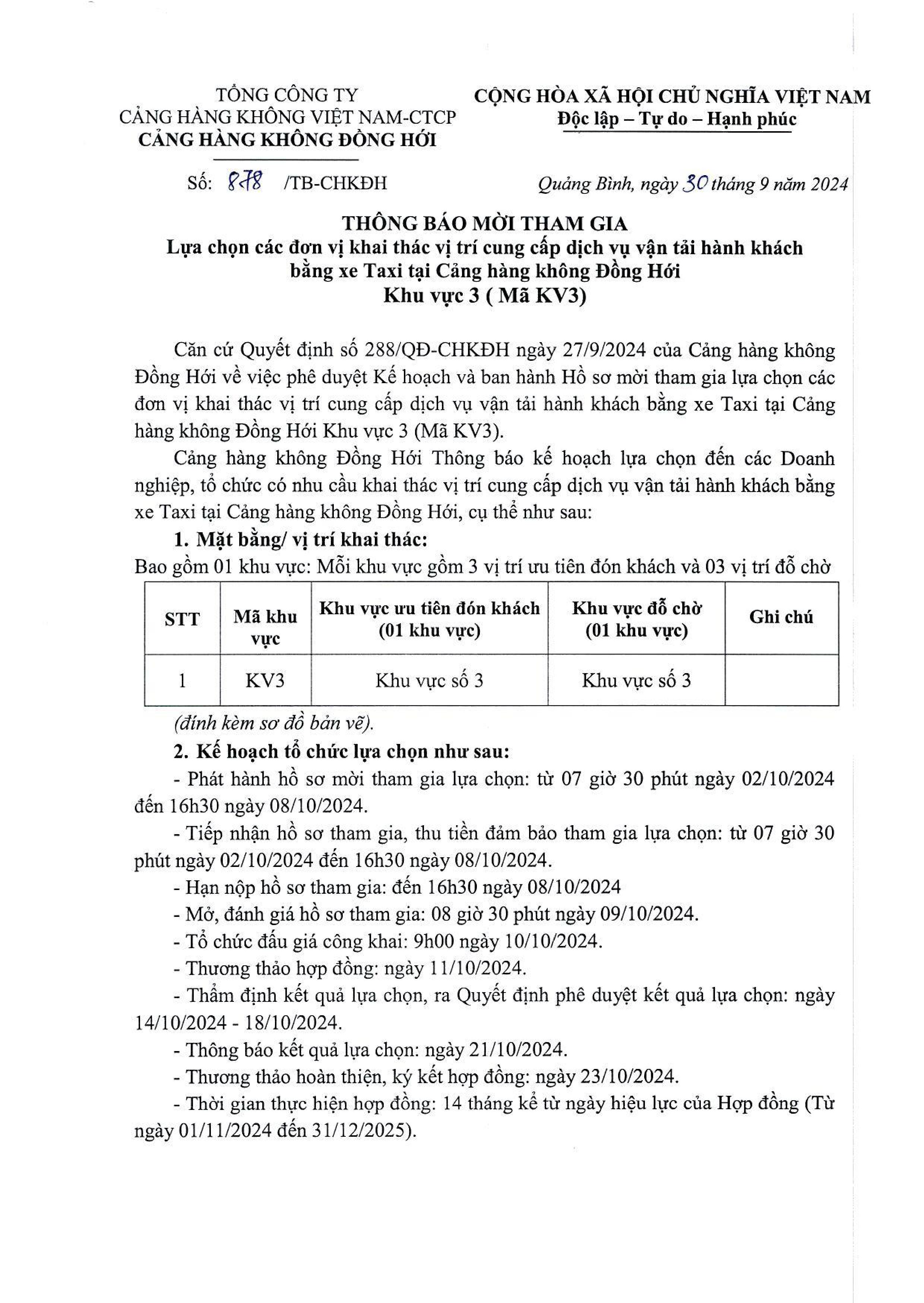 Thông Báo Mời Tham Gia: Lựa chọn các đơn vị khai thác vị trí cung cấp dịch vụ vận tải hành khách bằng xe Taxi tại Cảng hàng không Đồng Hới Khu vực 3 ( mã KV3)