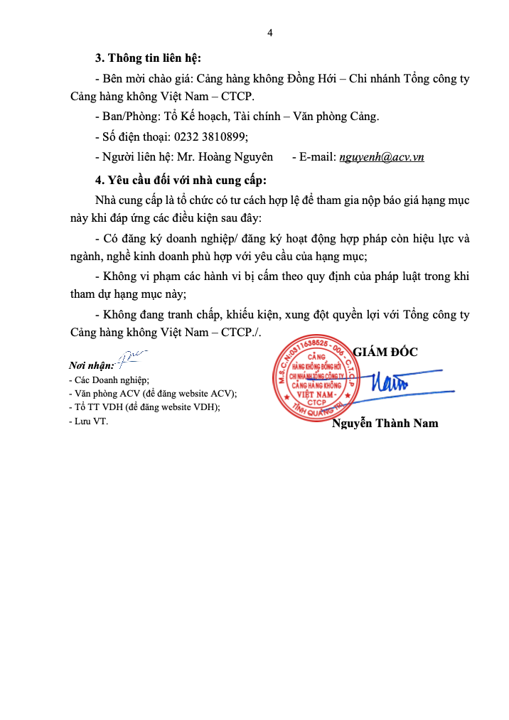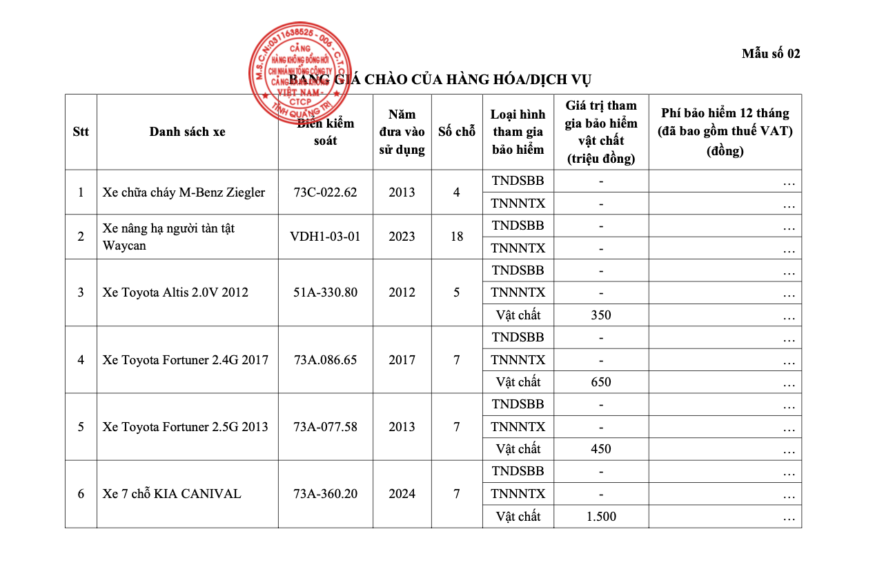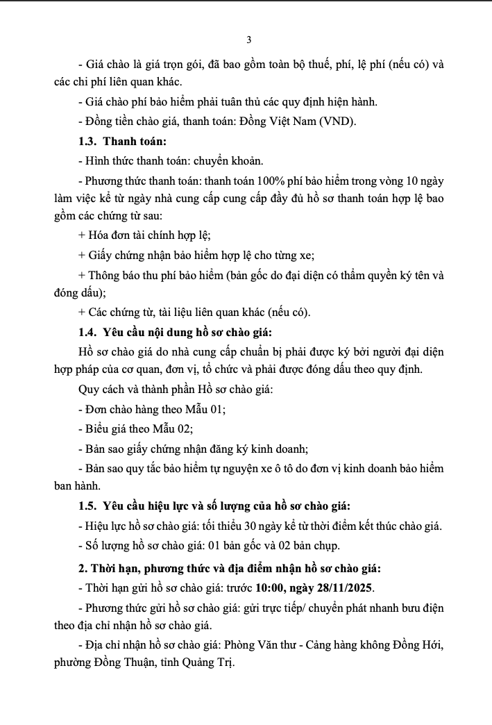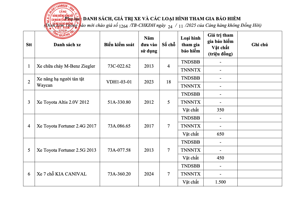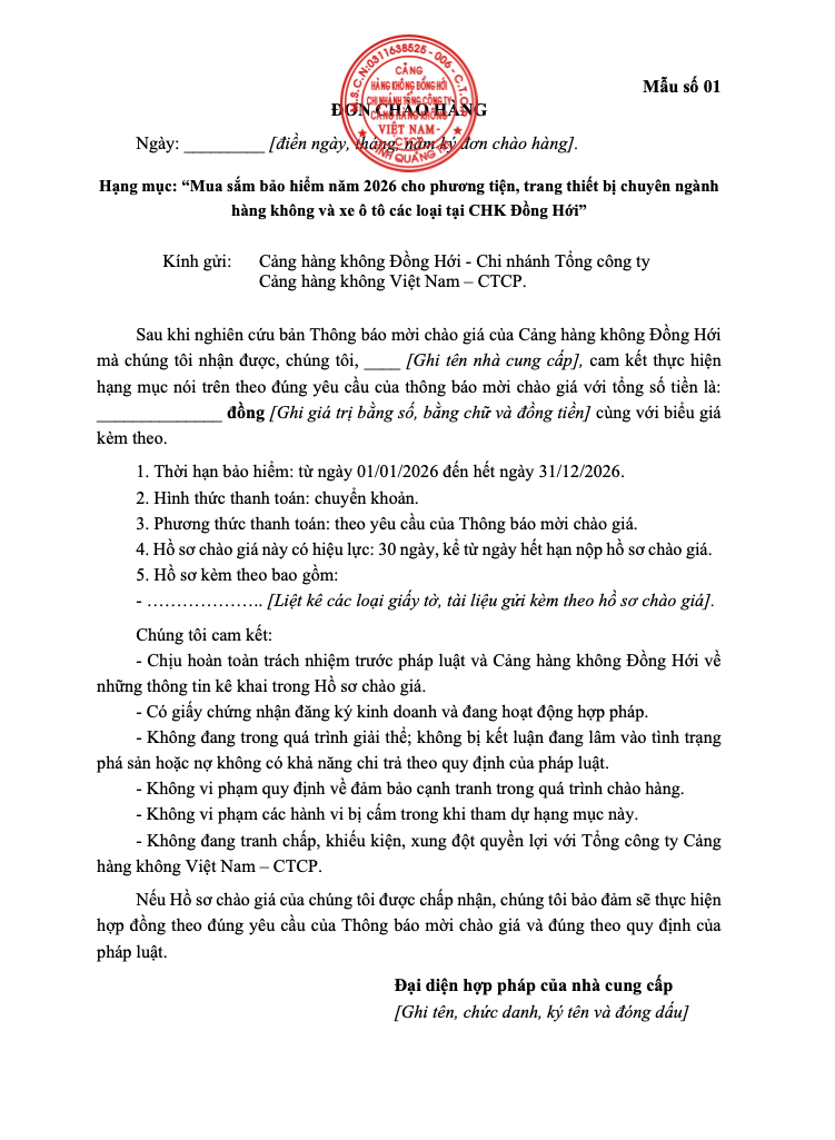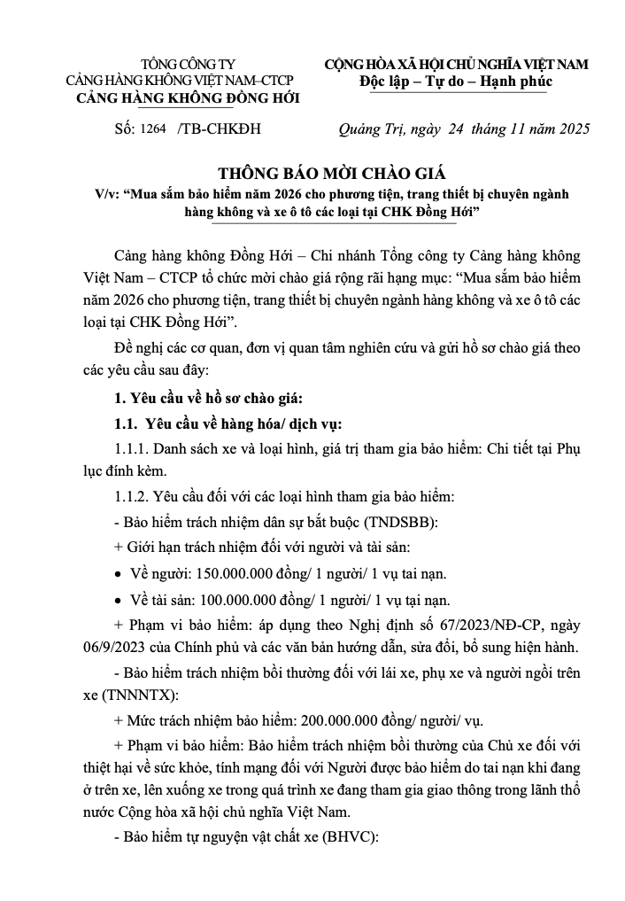 THÔNG BÁO MỜI CHÀO GIÁ V/v: “Mua sắm bảo hiểm năm 2026 cho phương tiện, trang thiết bị chuyên ngành hàng không và xe ô tô các loại tại CHK Đồng Hới”
