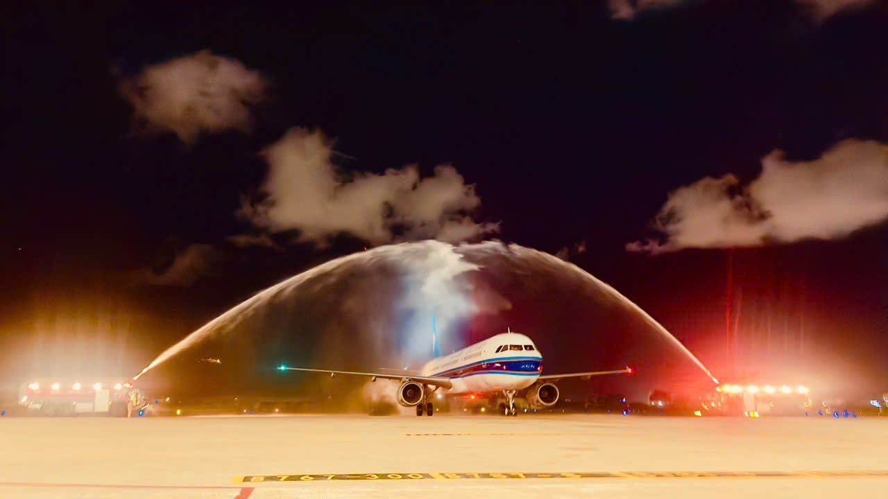 Water cannon salute to welcome the new flight