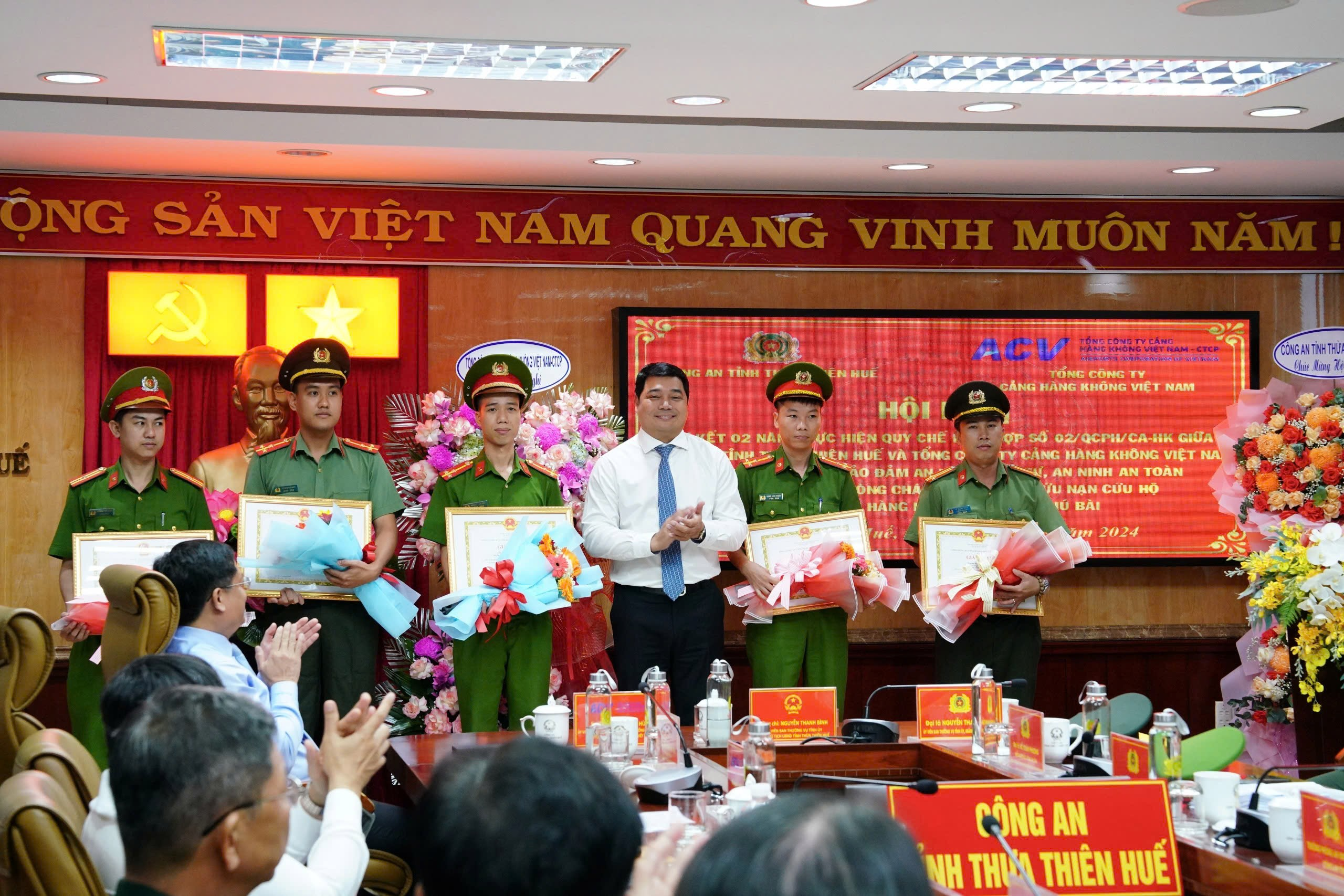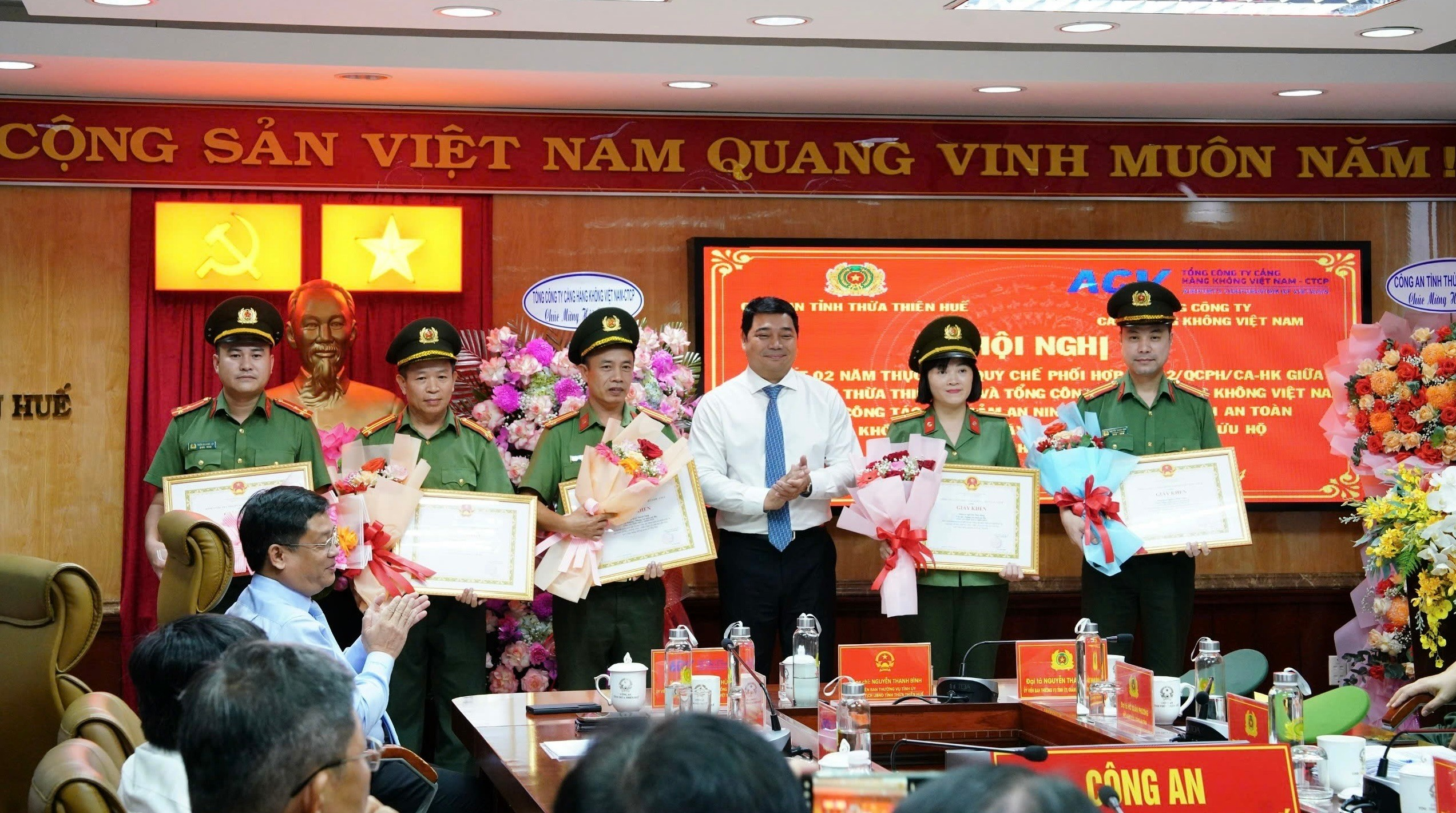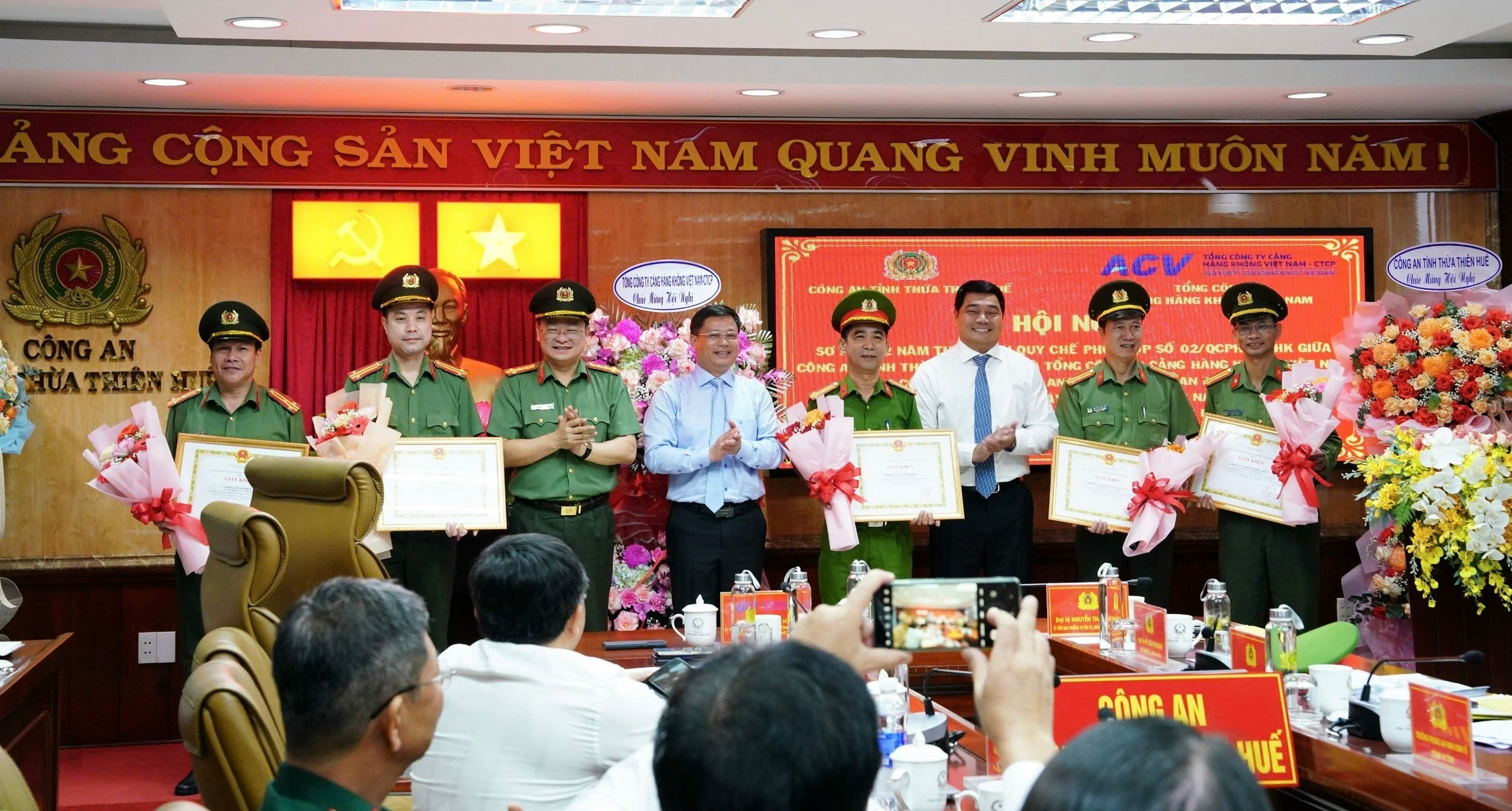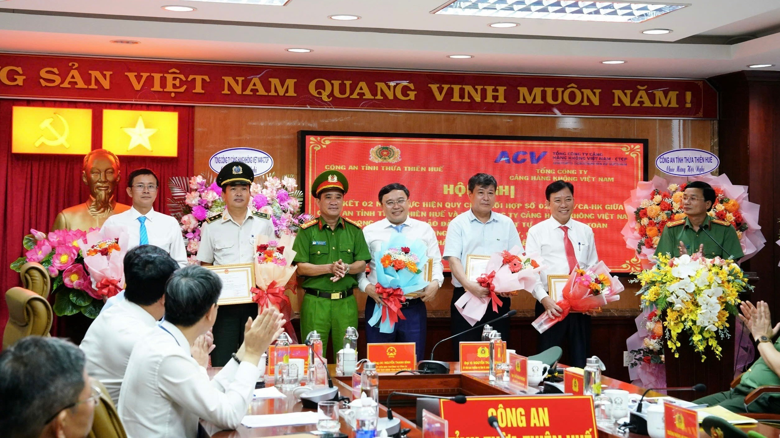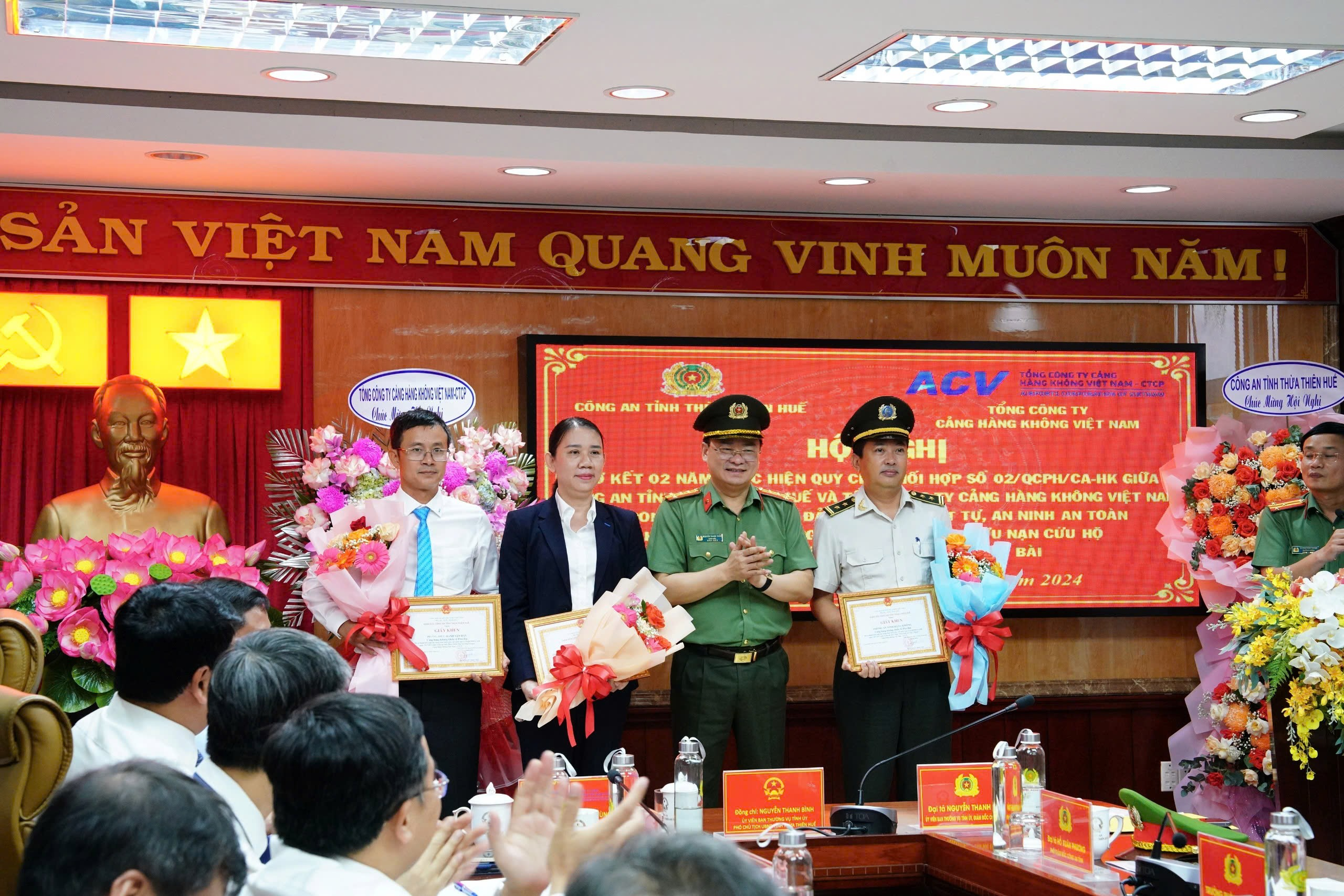 Nhân dịp này Công an tỉnh Thừa Thiên Huế và Tổng Công ty Cảng hàng không Việt Nam – CTCP đã tặng giấy khen cho 08 tập thể và 15 cá nhân có thành tích xuất sắc trong 02 năm thực hiện quy chế phối hợp.
