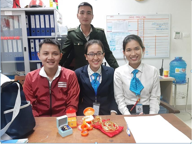 Tại phòng trực An ninh hàng không, dưới sự chứng kiến của các đơn vị liên quan, phòng An ninh hàng không tiến hành mở kiểm tra trực quan, kết quả kiểm tra bên trong túi có 05 vòng vàng kim loại, 05 sợi dây chuyền vàng, bốn chiếc bông tai kim loại vàng, 04 chiếc nhẫn vàng và các vật dụng cá nhân khác. Tổng giá trị tài sản hơn 100 triệu đồng.
