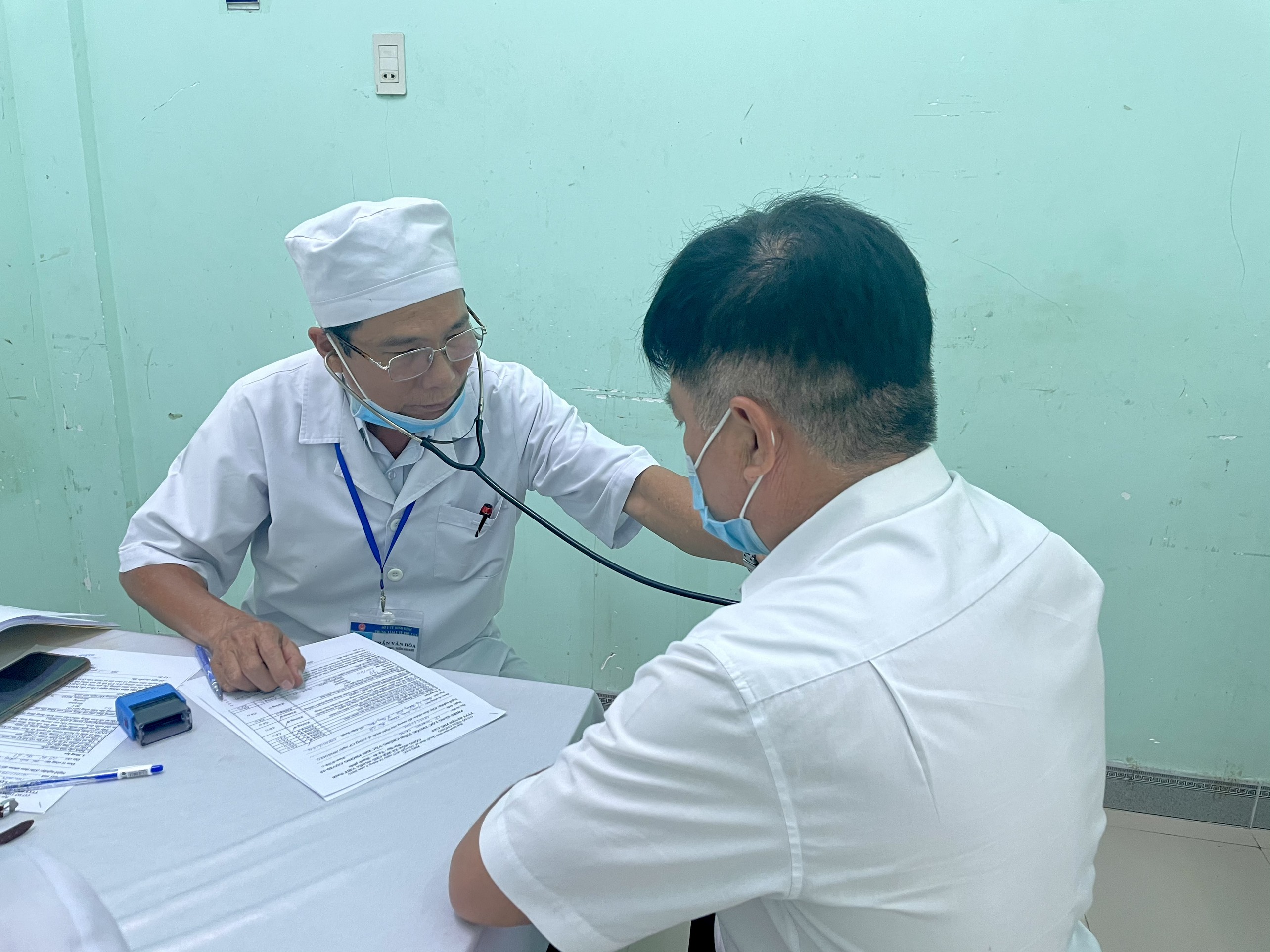Bác sĩ Trung tâm Y tế Huyện Phù Cát khám sàn lọc và tư vấn trước khi tiêm vacxin