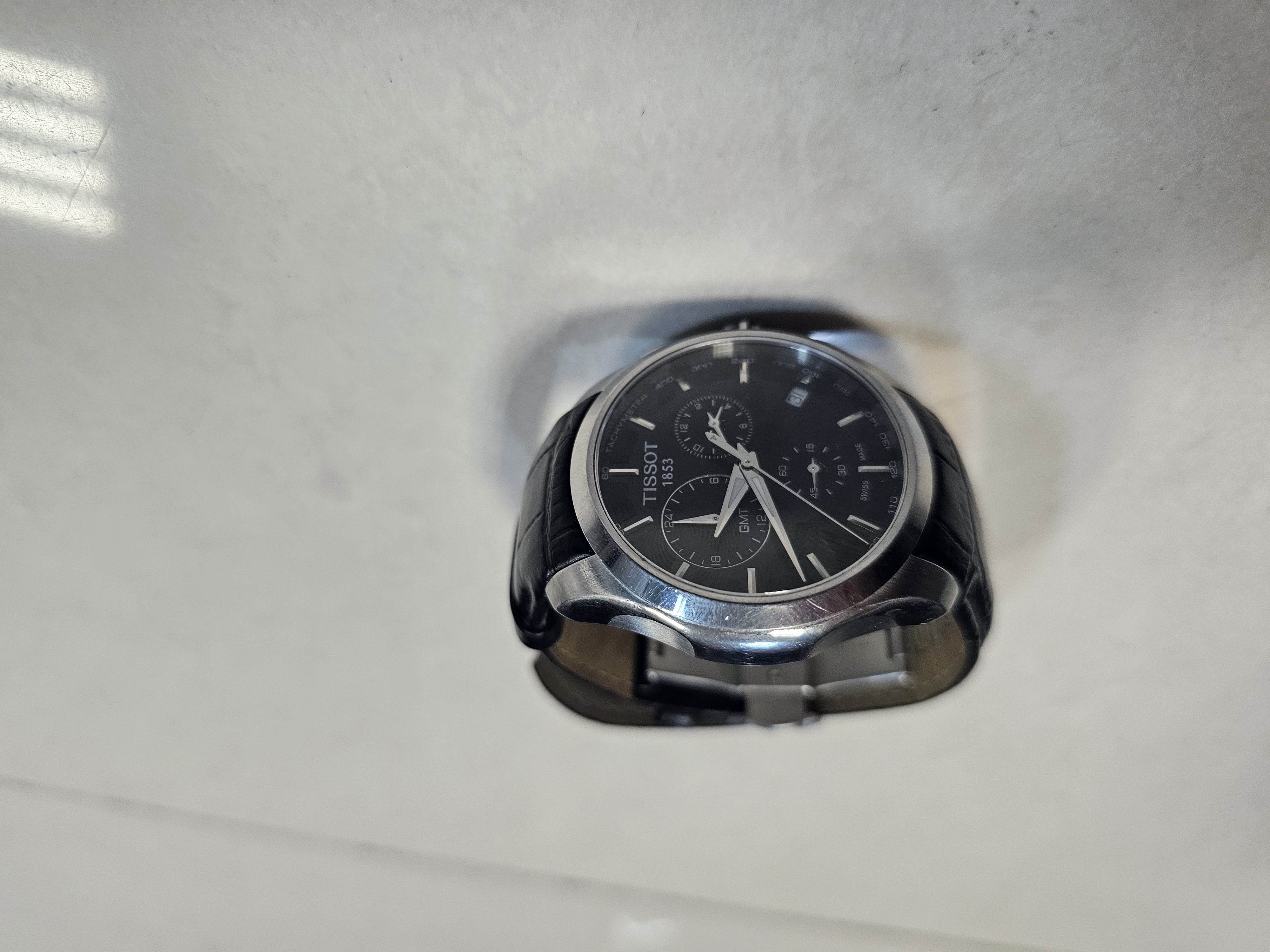 01 đồng hồ kim loại màu trắng dây da màu đen hiệu TISSOT, được tìm thấy vào ngày 05/08/2024