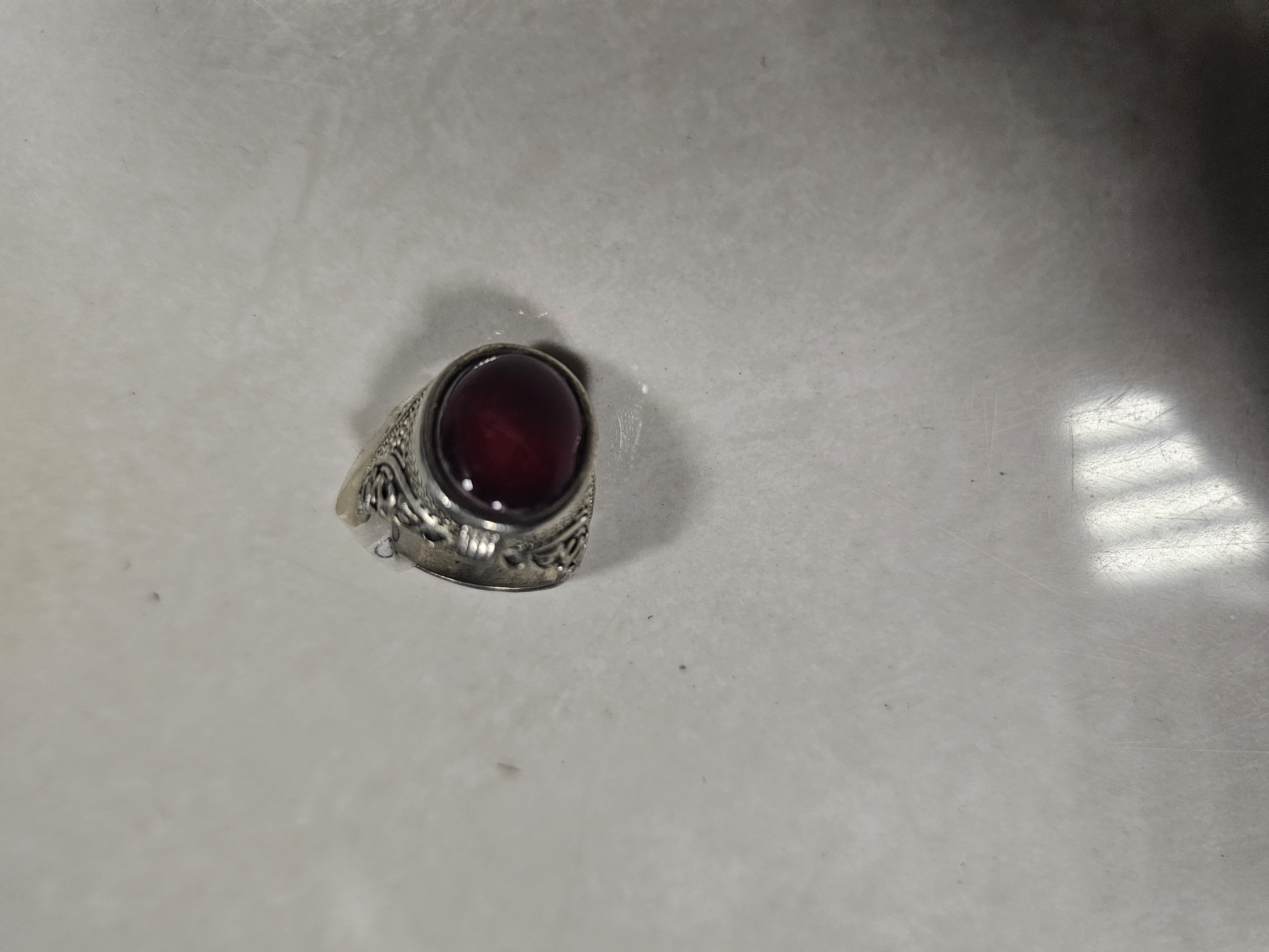 01 nhẫn kim loại màu bạc, đính đá màu đỏ, được tìm thấy vào ngày 01/02/2024, ở ANSC HLXT quốc nội.