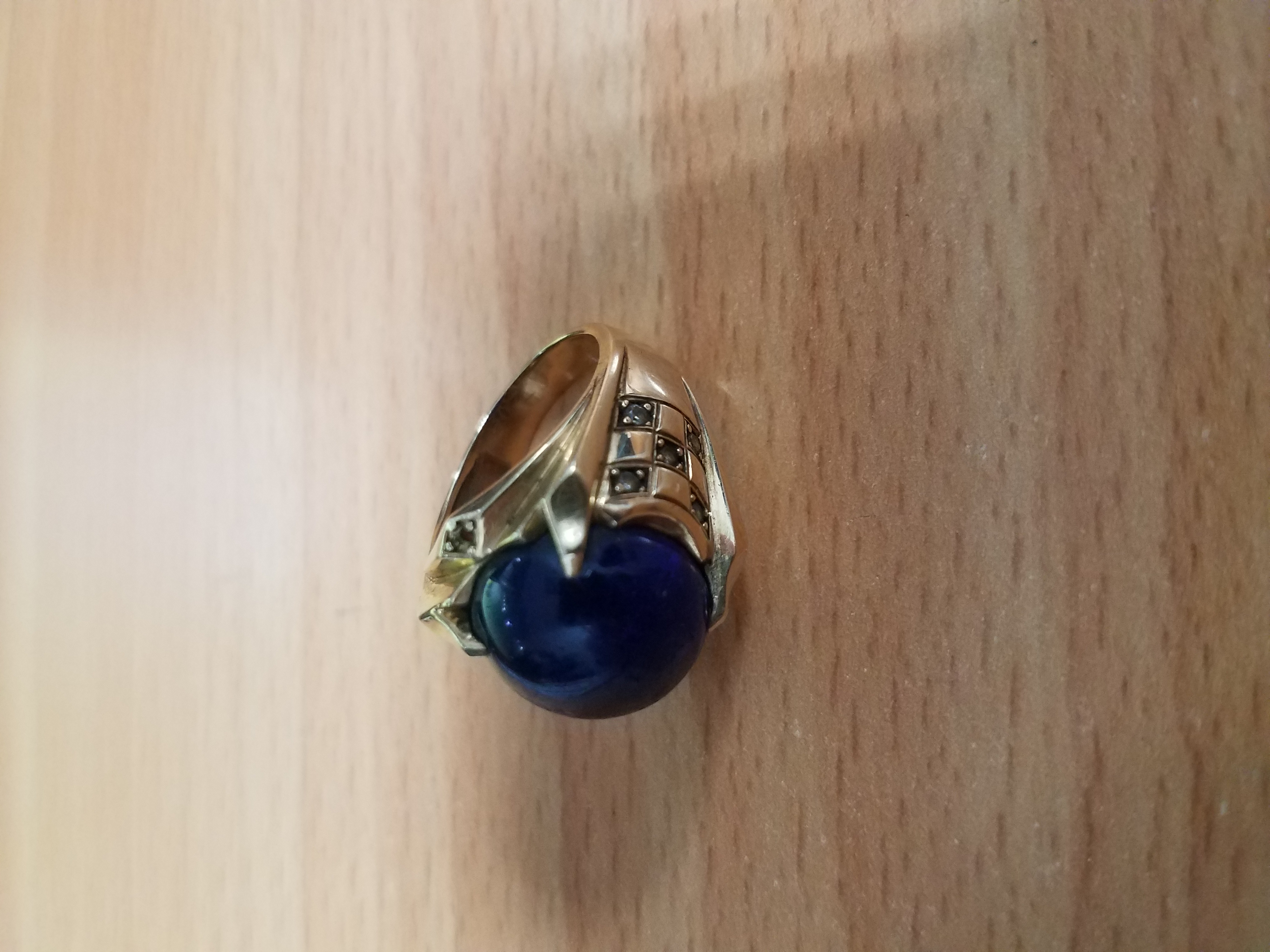01 nhẫn kim loại màu vàng, đính đá màu xanh tím, ngày 10/05/2023
