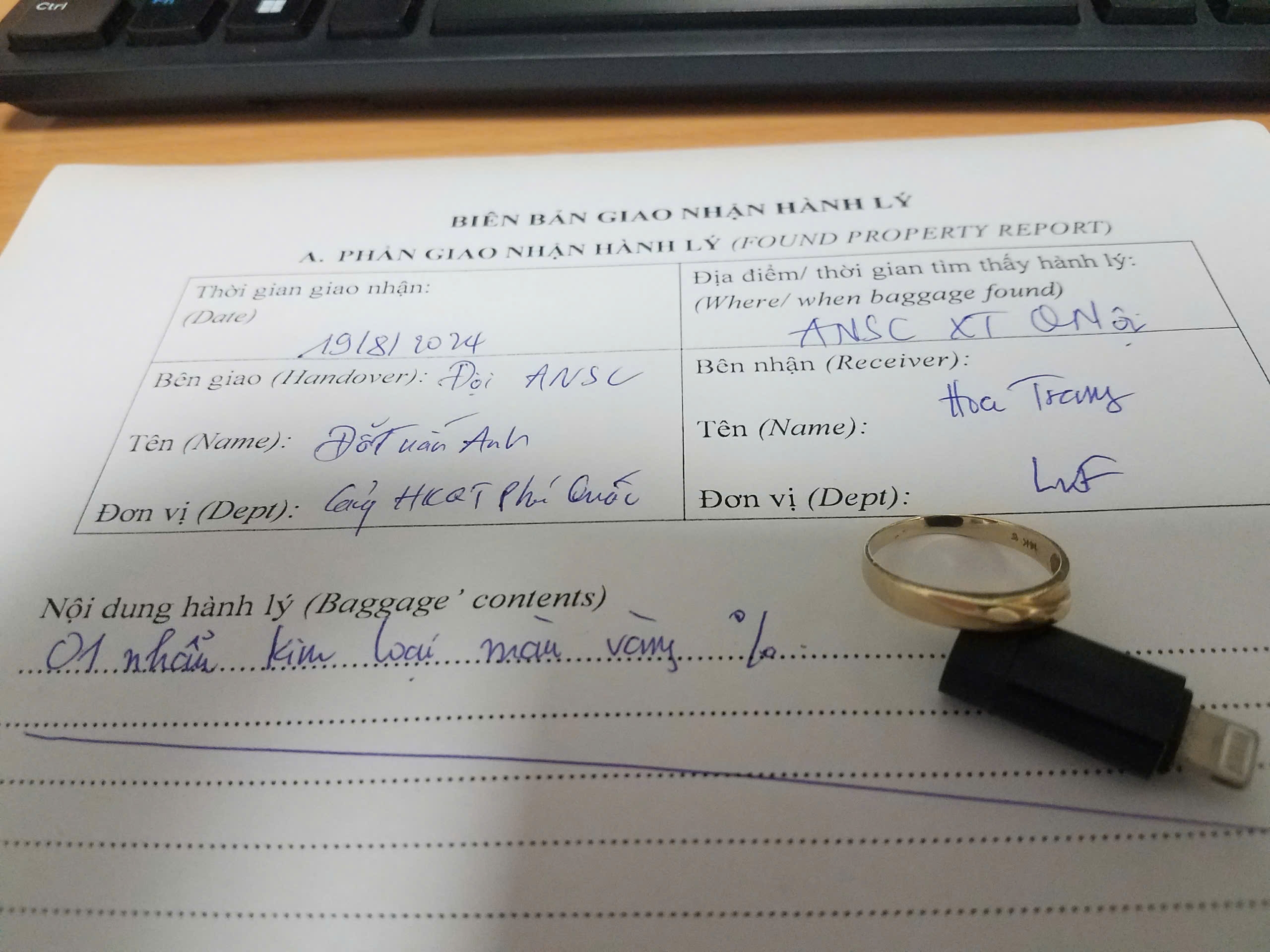 01 nhẫn kim loại màu vàng, được tìm thấy vào ngày 19/08/2024
