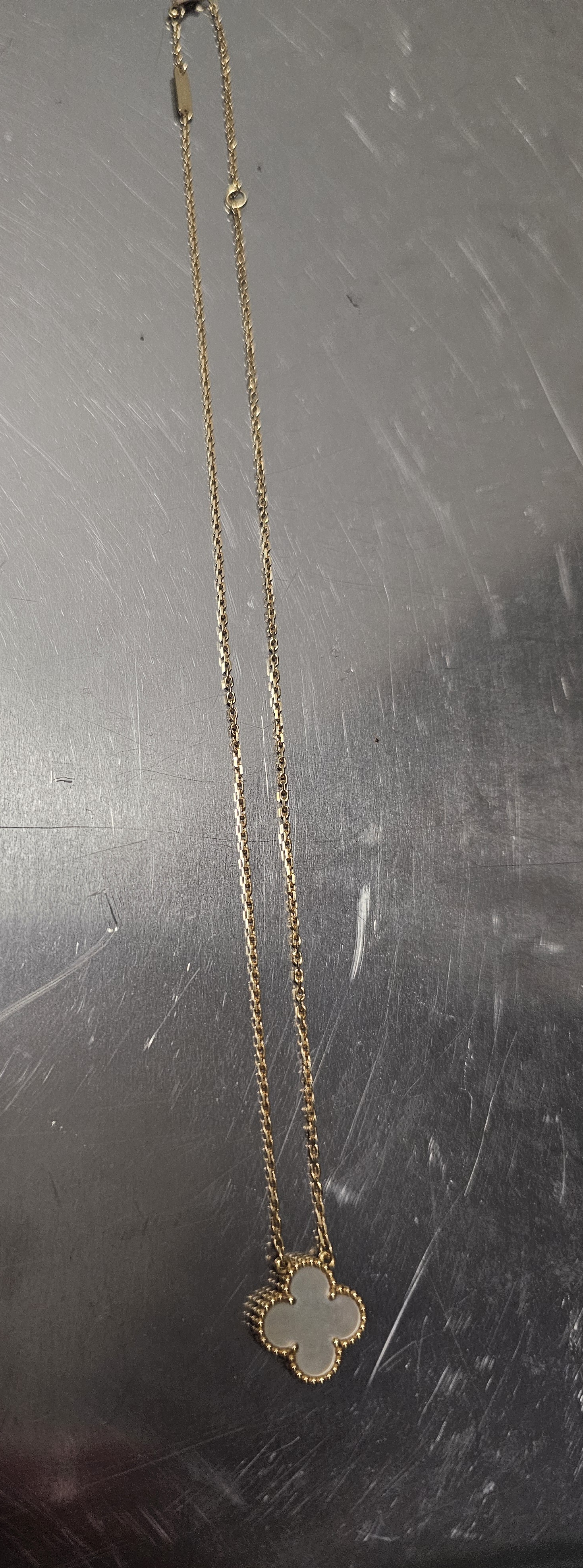 01 sợi dây chuyền kim loại màu vàng kèm mặt cỏ 4 lá, được tìm thấy ở Khu vực công cộng vào ngày 05/04/2025