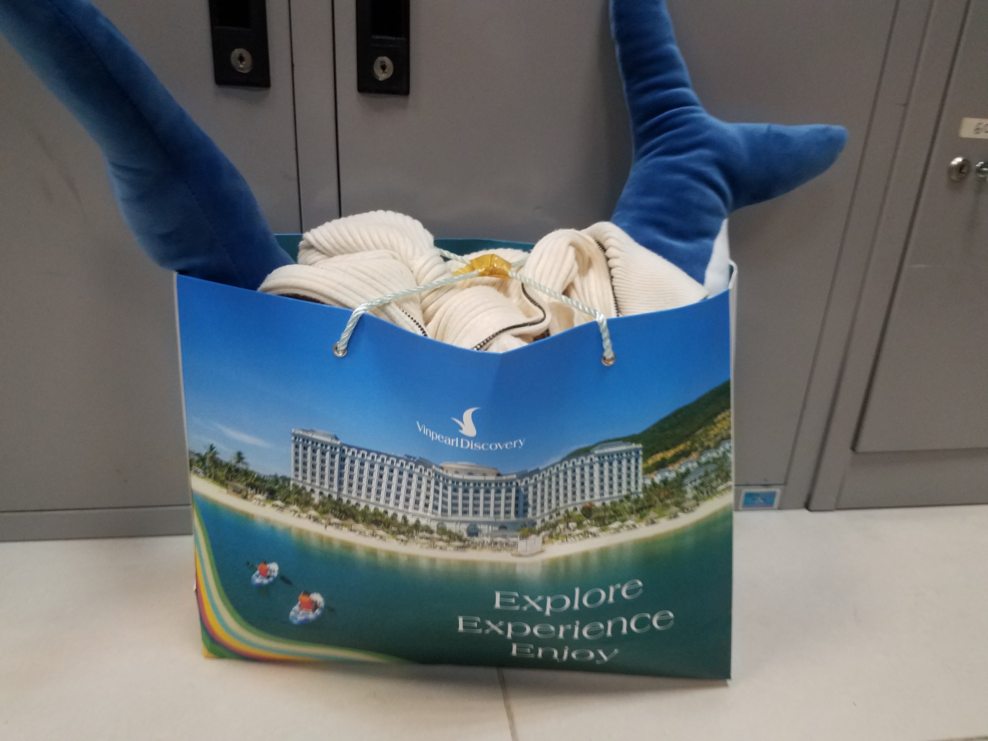 01 túi giấy, trong có 02 thú bông cá heo và 01 áo khoác màu kem, ngày 02/05/2023