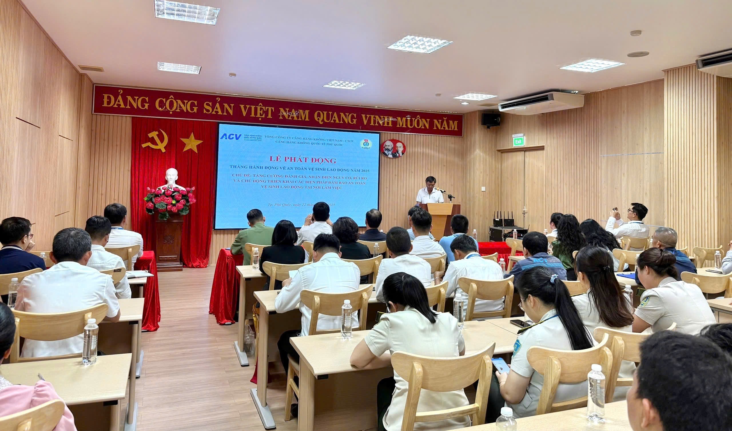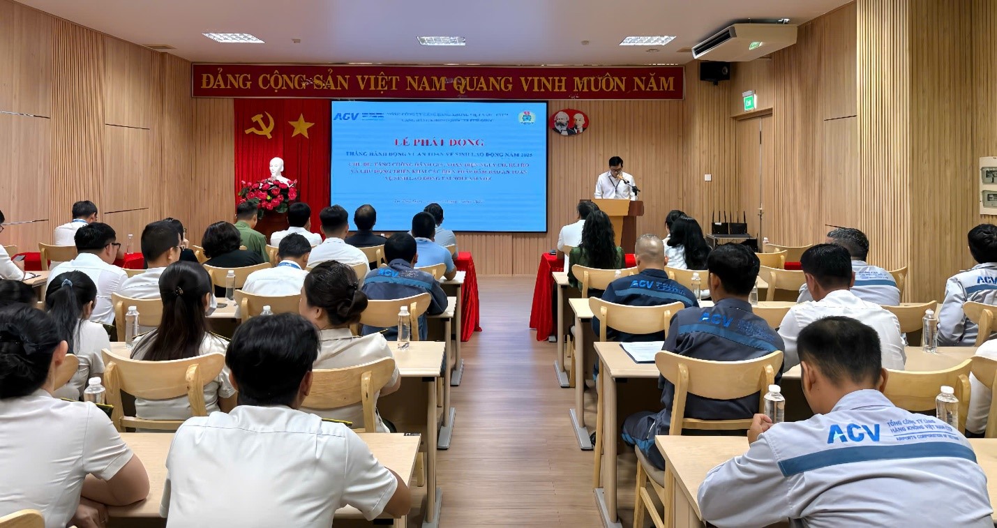 Sáng ngày 22/5/2025, Cảng hàng không quốc tế Phú Quốc đã tổ chức lễ phát động Tháng hành động về An toàn, vệ sinh lao động năm 2025 với chủ đề: “Tăng cường đánh giá, nhận diện nguy cơ, rủi ro và chủ động triển khai các biện pháp bảo đảm an toàn, vệ sinh lao động tại nơi làm việc của Cảng hàng không quốc tế Phú Quốc”.